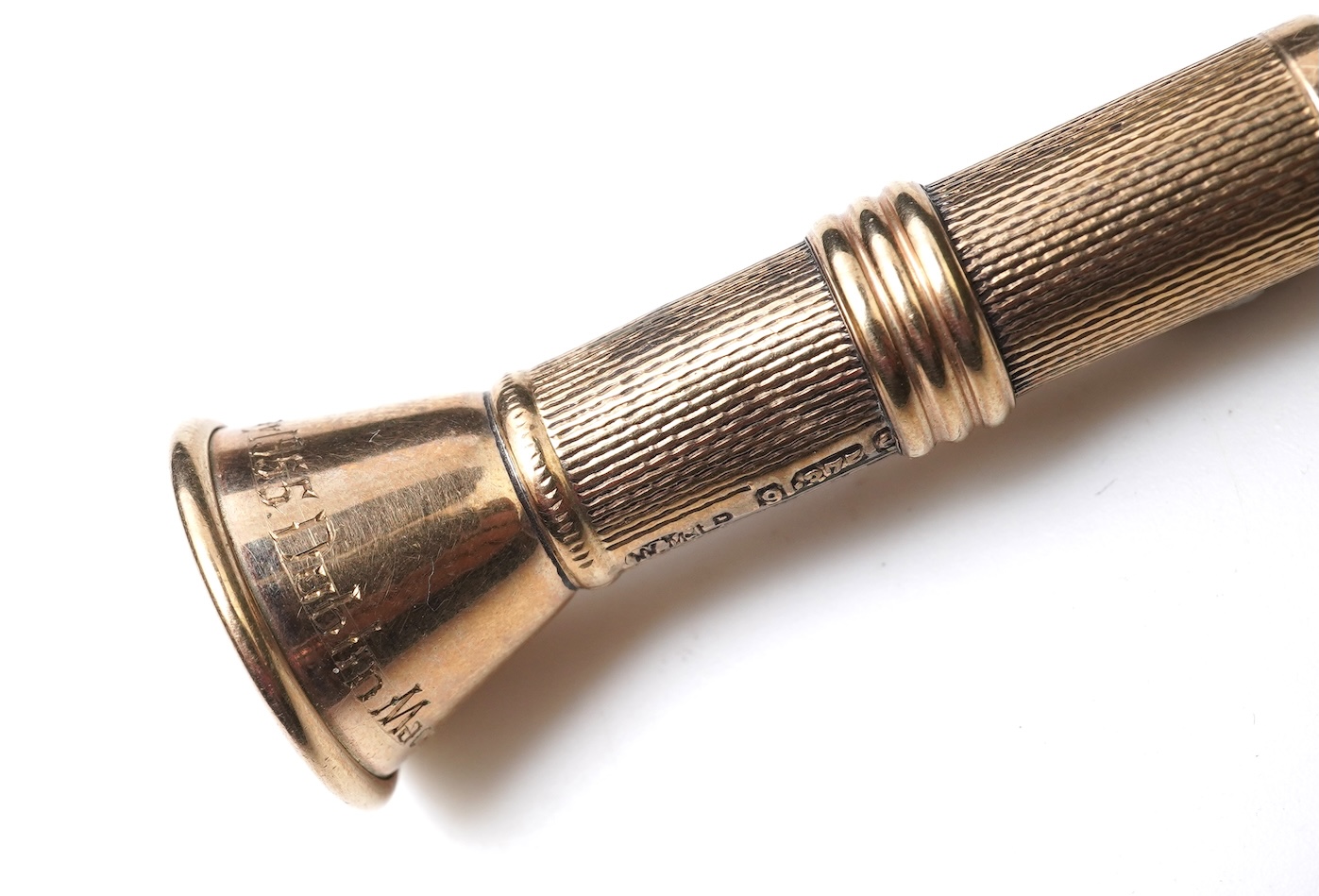 A 9ct gold cigar piercer, mid 20th century, of flared design, the piercer operated by pushing the top down, inscribed 'Maccabi Iodack Solomons May 1955 Dublin', length 7.4cm, British hallmarks, gross weight approximately 8.5 grams