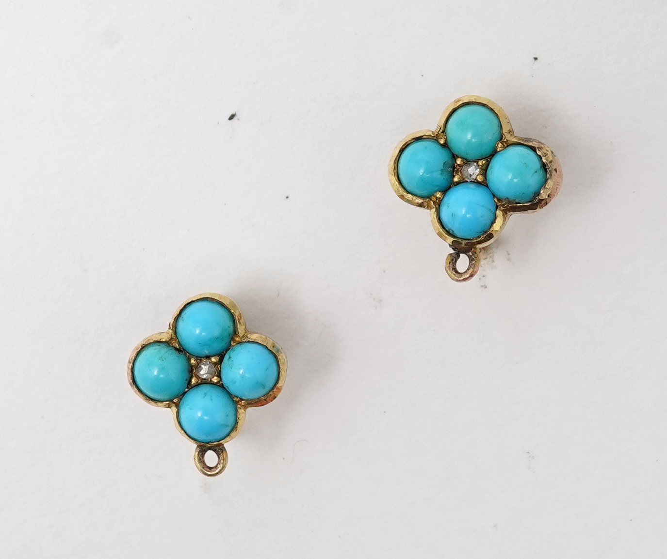 A collection of coral and turquoise jewels, comprising: a coral bead necklace, beads approximately 6-7mm, to a gold spherical clasp, necklace length 102cm, clasp stamped 375, gross weight approximately 61 grams; a pair of earrings of knotted design, set with coral cabochons, length 3.4cm each, hook fittings; and a pair of quatrefoil turquoise and rose-cut diamond earrings, length 1.3cm each, screw fittings, together with a pair of detached pear-shaped cabochon turquoise drops