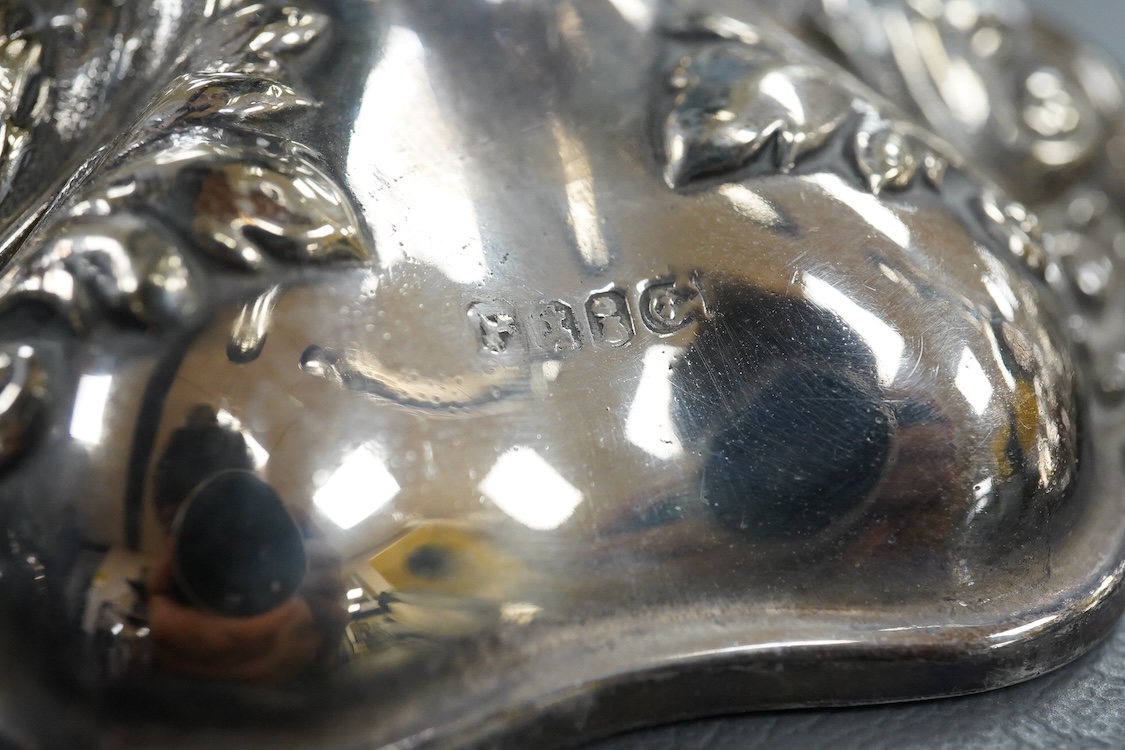 Lot 880 , A modern silver mounted rectangular cigarette box, London, 1985, with engraved crest and motto, 15.5cm, together with a silver cigarette case, a George V pierced silver sugar basket with blue glass liner, a cased set of