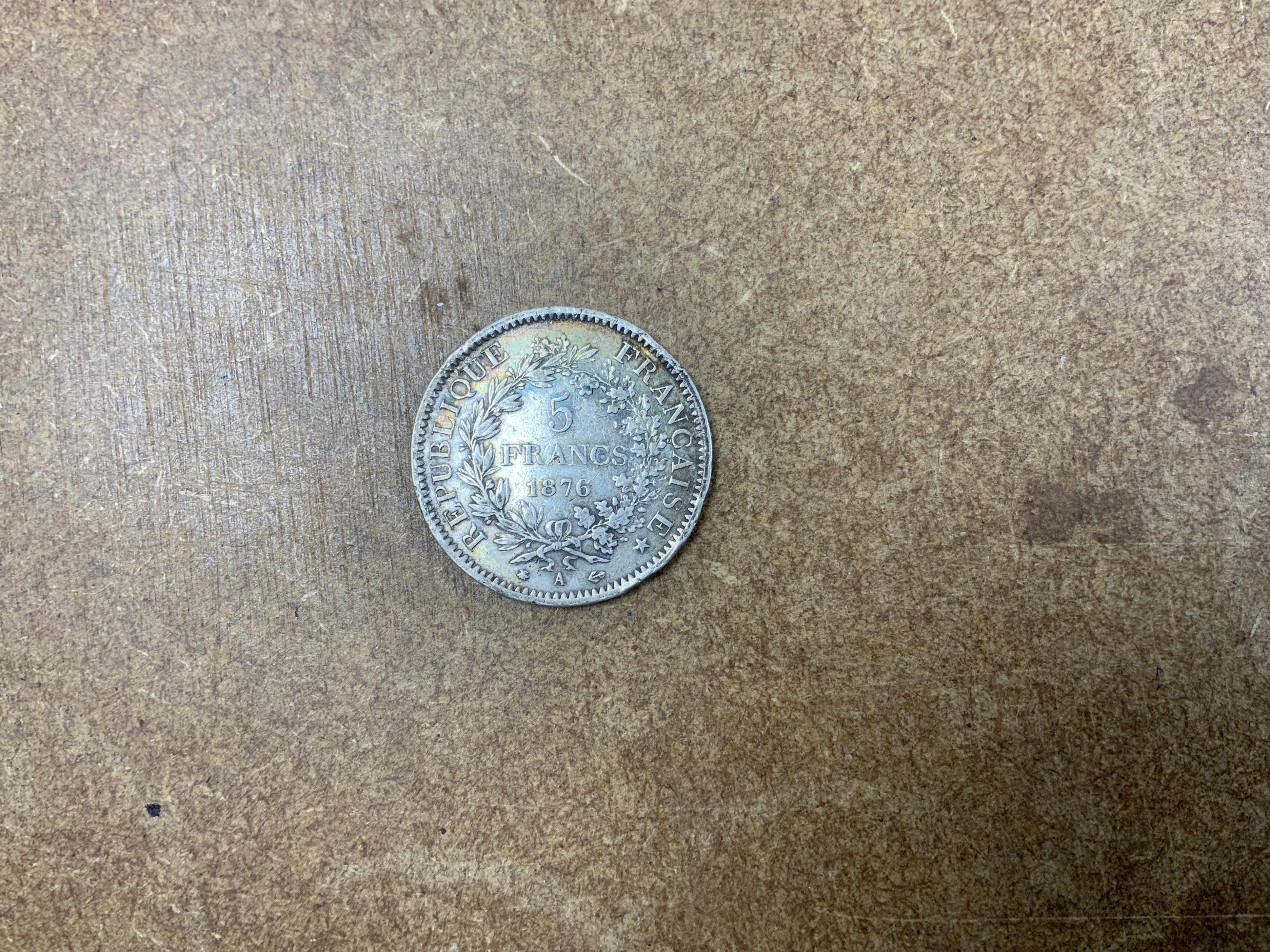 British coins, Victoria to Elizabeth II, comprising halfcrowns, shillings, florins, sixpences, silver and brass threepences, together with a Republic of France five francs , 1876
