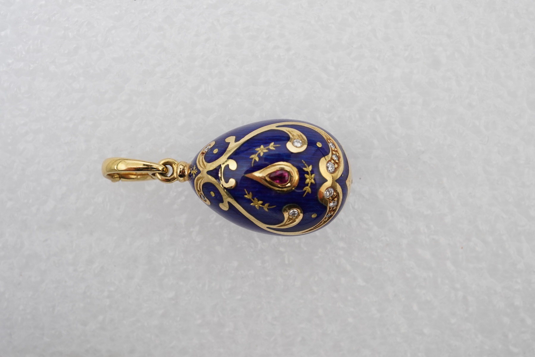 Fabergé, a modern gold, enamel and diamond pendant, designed as an egg, applied with blue guilloché enamel decorated with gold scrollwork in reserve, set with brilliant-cut diamonds and a pear-shaped ruby, length 4cm including bail, signed Fabergé, limited edition number 7/200, stamped 750, gross weight 17 grams
