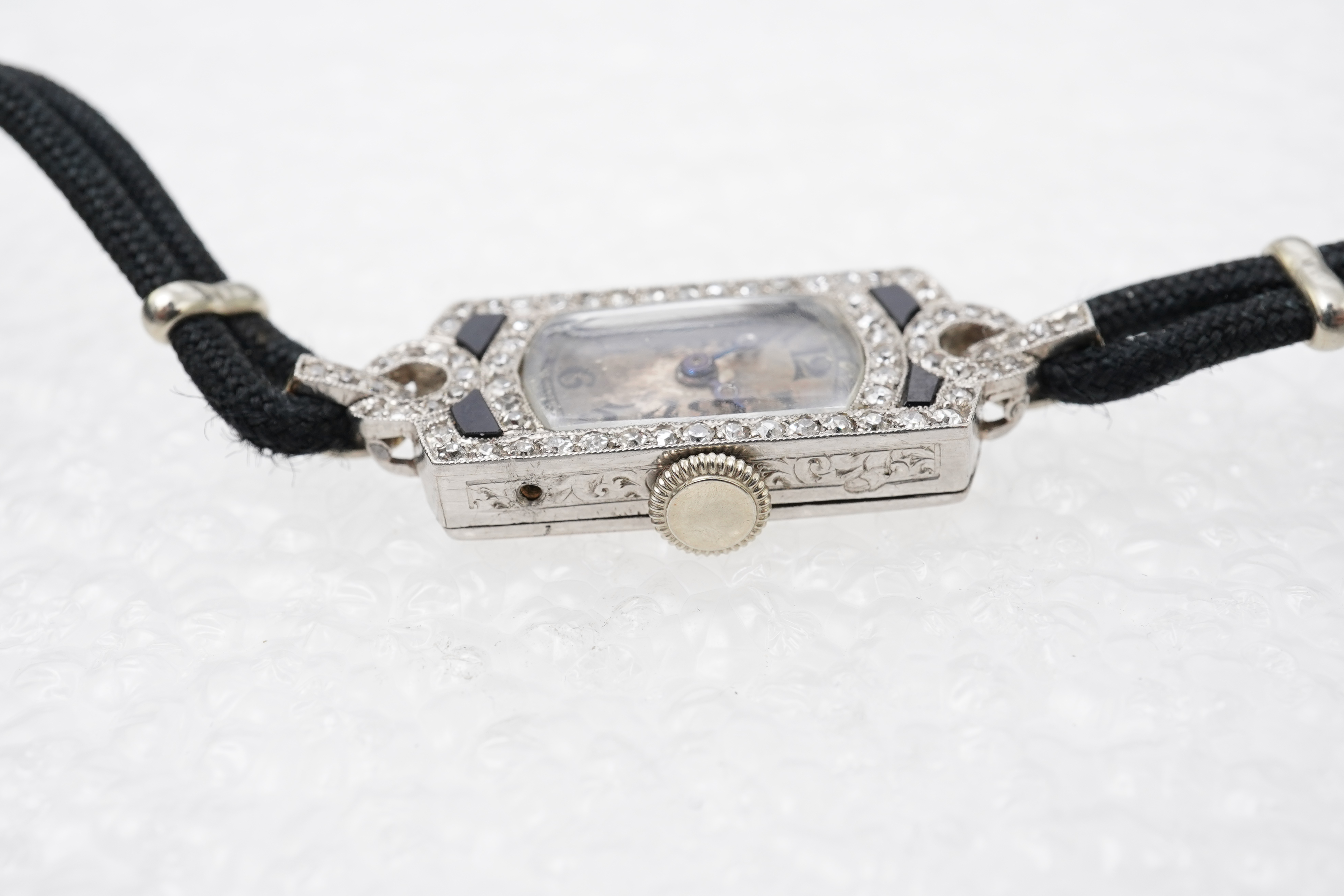 An Art Deco onyx and diamond cocktail watch, France, circa 1920, the silvered dial with Arabic numerals and blue steel hands, to a case of geometric design set with circular-cut diamonds and panels of onyx, to a black cord strap, case width 1.1cm, bracelet length 13cm, manual winding movement numbered 35448, case back numbered 10885, case with French assay marks for platinum, and maker's mark GM with crossed hammers, interior with French assay mark for 18ct gold
