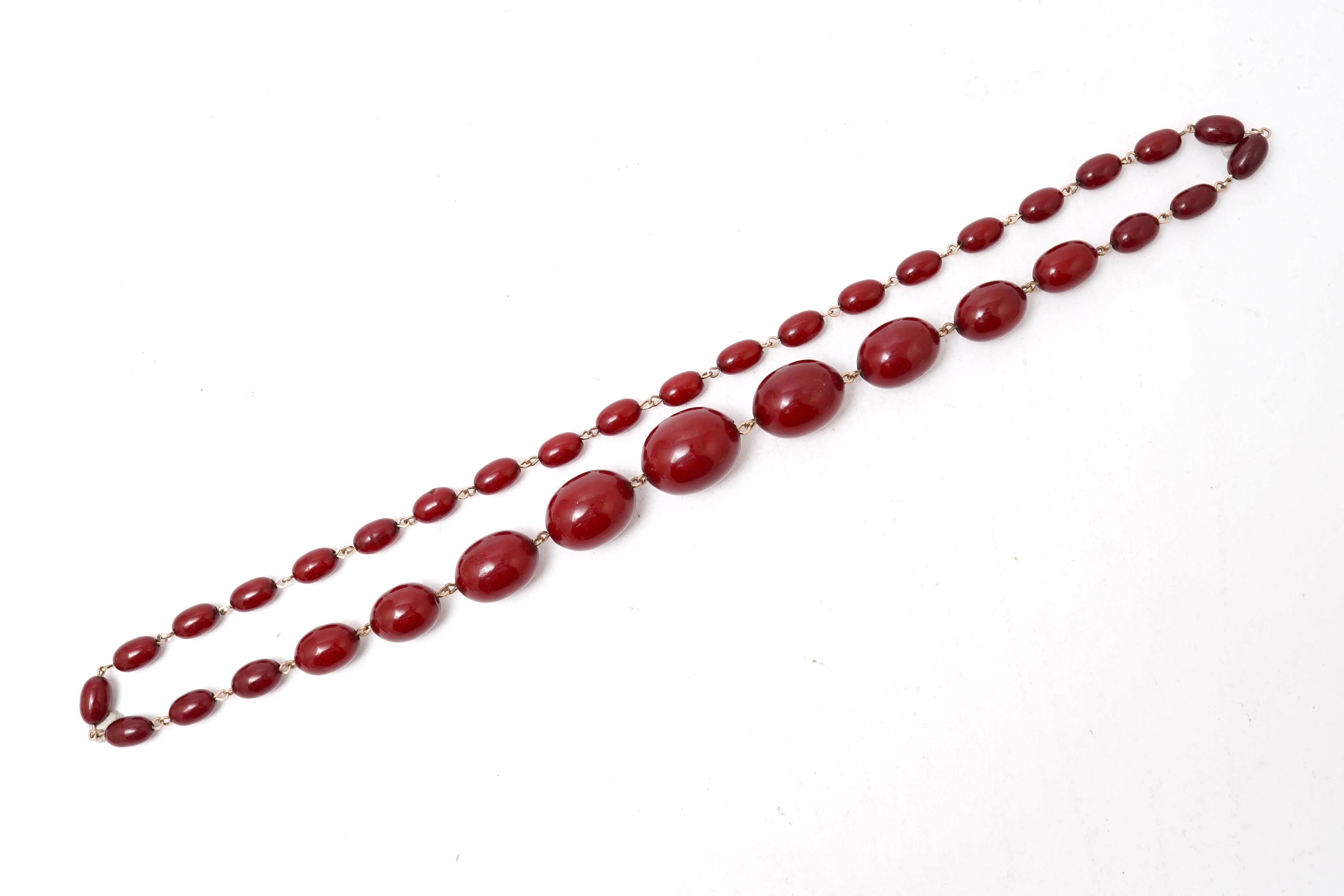 Lot 193 , A cherry-coloured bakelite imitation amber necklace and a glass bead necklace