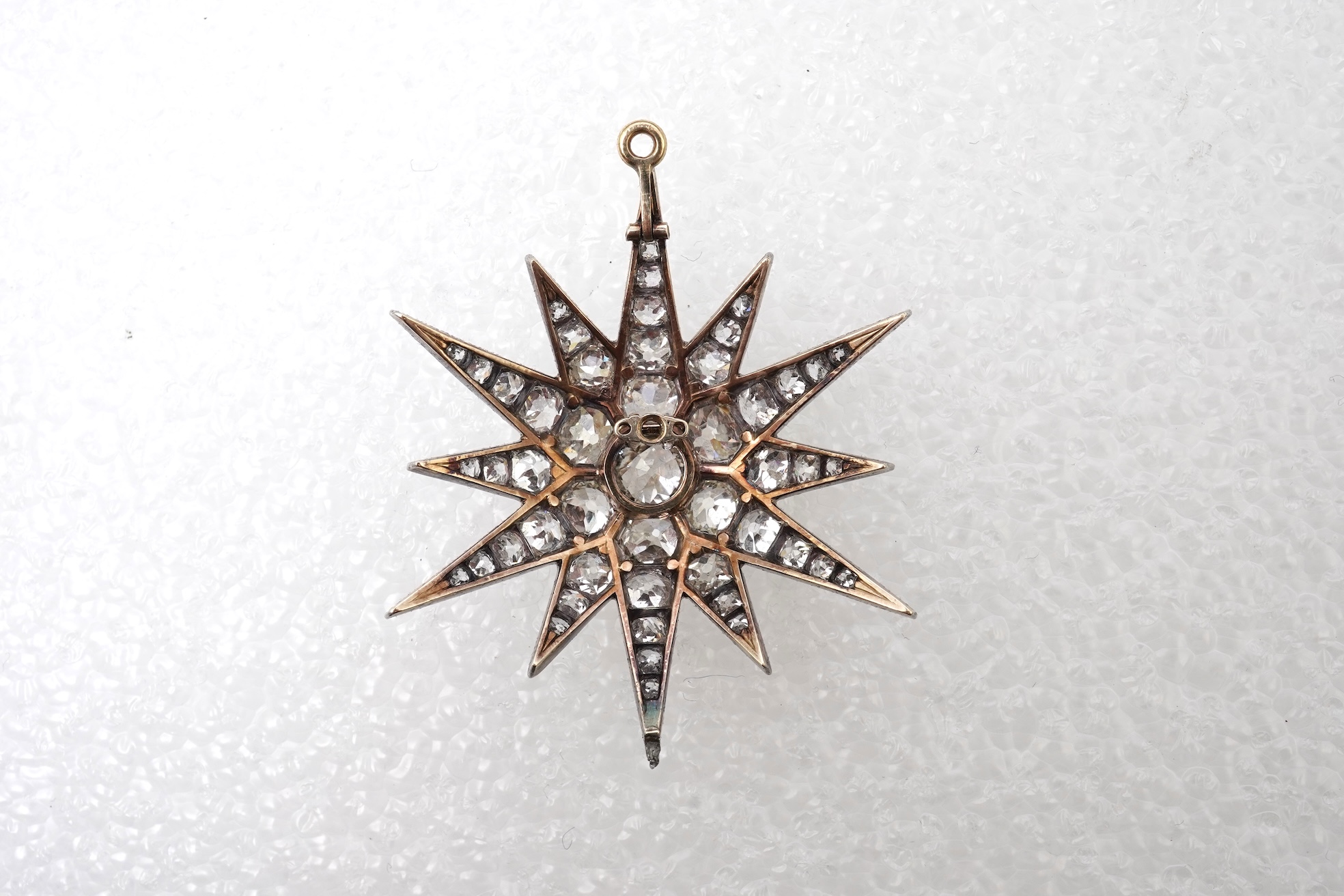 A Victorian diamond brooch/pendant, late 19th century, designed as a star, set with cushion-shaped diamonds totalling approximately 7.00 carats, the central diamond estimated to weigh approximately 1.00 carat, mounted in silver and gold, length 4.7cm, retractable pendant fitting, detachable brooch fitting, original fitted case initialled MLM,
