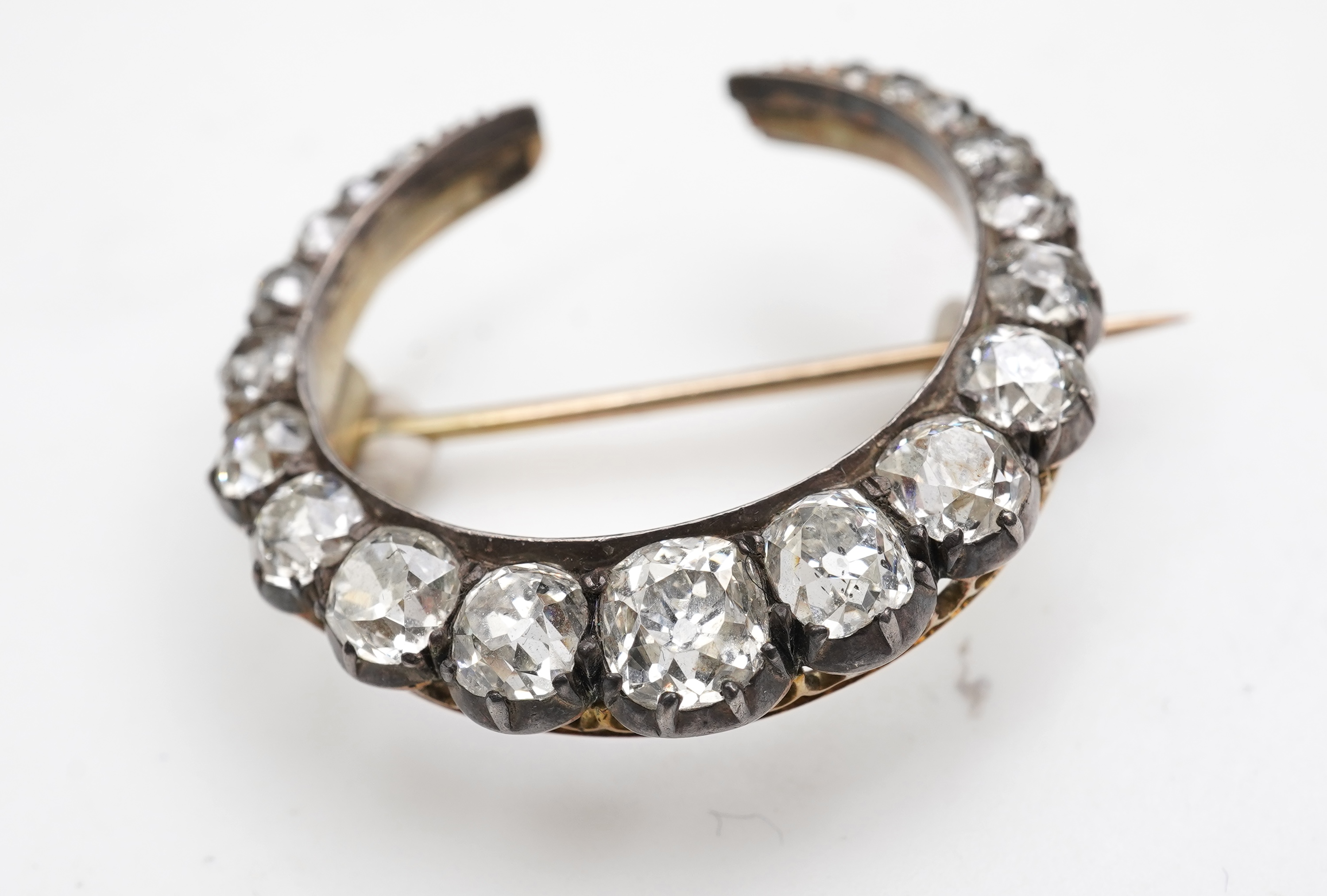 A Victorian diamond brooch, late 19th century designed as a crescent moon, set with cushion-shaped diamonds totalling approximately 2.50 carats, mounted in silver and gold, length approximately 3cm, fitted case stamped Carrington & Co