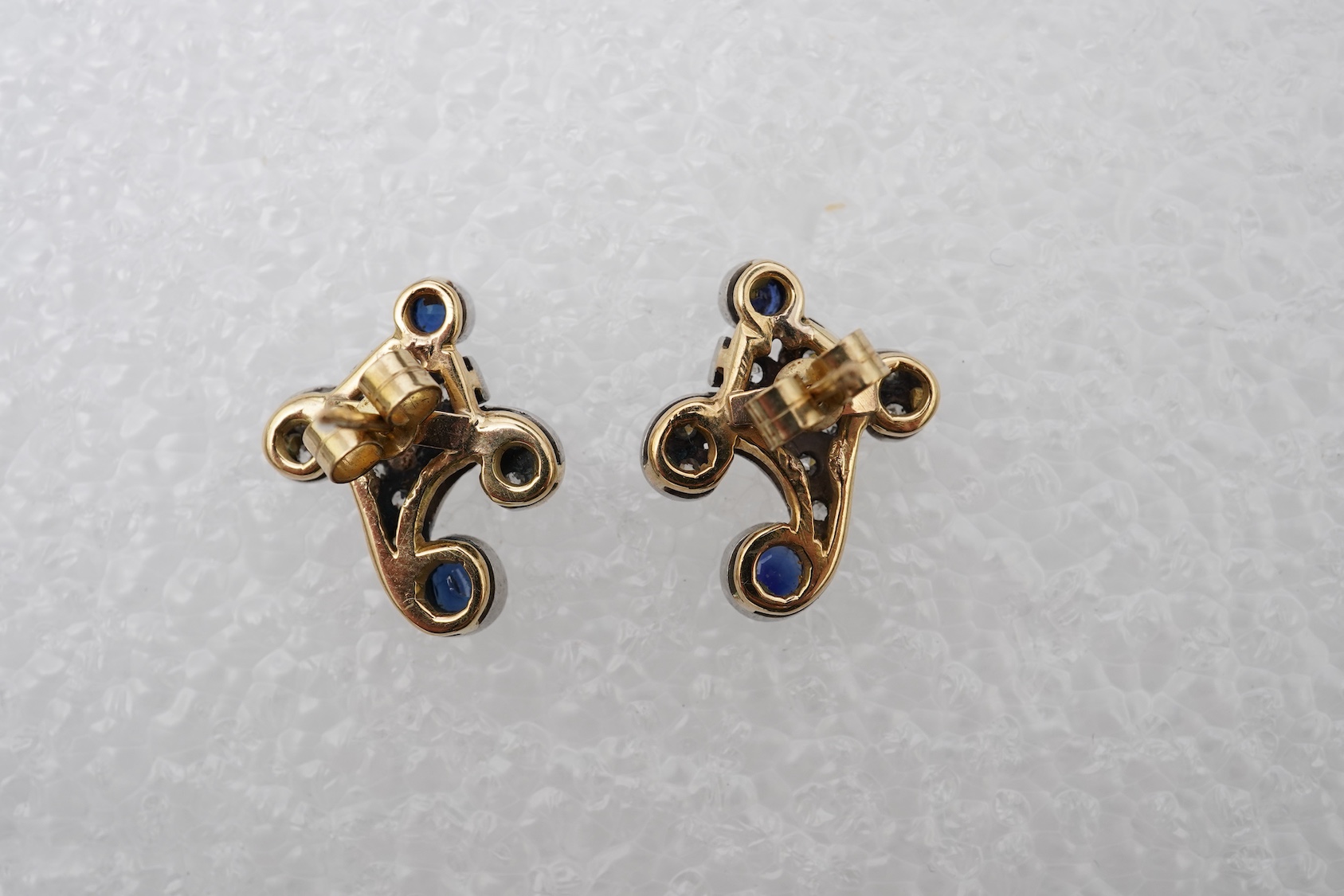 A pair of sapphire and diamond earrings, each of scrolled design, set with brilliant-cut diamonds totalling approximately 0.50 carats, and circular-cut sapphires, mounted in silver and gold, length 1.9cm each, post fittings