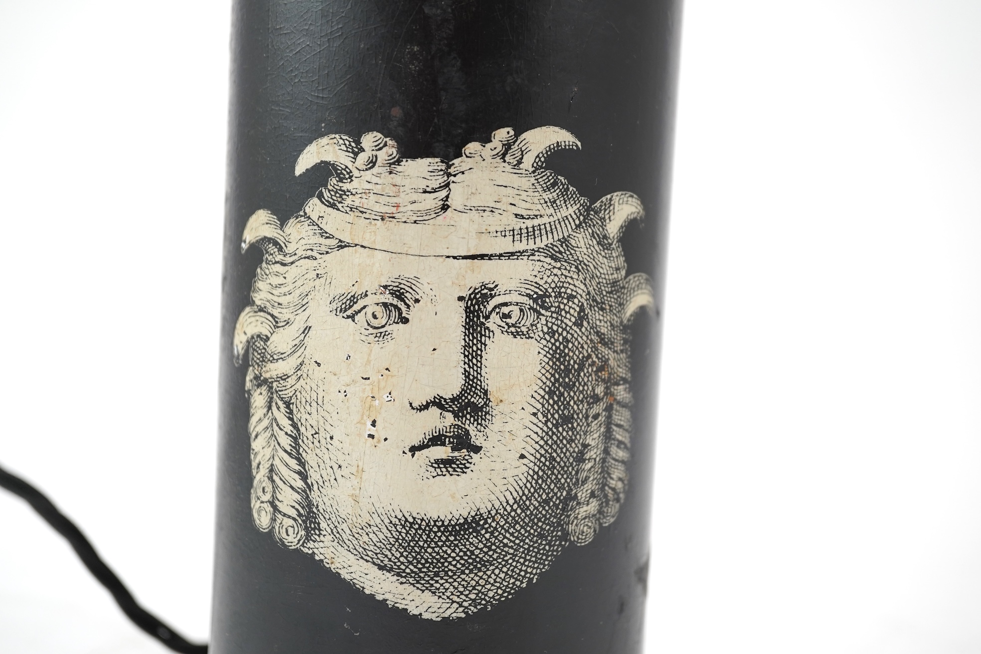Piero Fornasetti (Italian, 1913-1988): A table lamp, the cylindrical body with lithographic transfer print of classical heads, brass fittings, 53cm high (including conical shade)