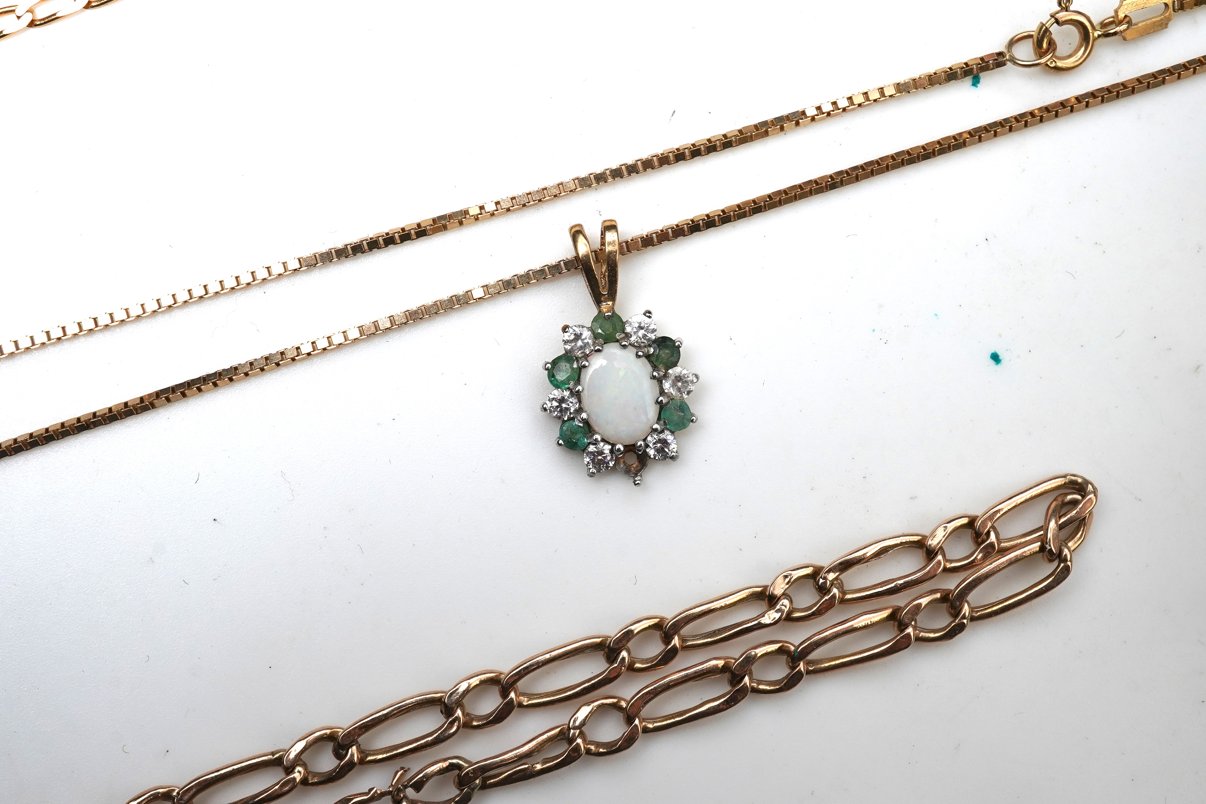 A collection of jewels, comprising: a dress ring of textured design set with sapphires in an 'S'-shaped arrangement; an onyx signet ring; a garnet and diamond half-hoop ring; a ruby and diamond half hoop ring; a diamond ring and matching pendant; a diamond half hoop ring; a figaro chain bracelet; and an opal, emerald and cubic zirconia cluster pendant necklace, one emerald deficient, all with British hallmarks for 9ct gold, combined gross weight approximately 29 grams; a faience scarab ring mounted in gold, size R, stamped 15CT, gross weight approximately 4 grams; a platinum wedding band, size L, inscribed 'ALL MY LOVE', dated 29.5.48, gross weight 3 grams; a heart-shaped locket and a Maltese cross pendant, each on chains, each stamped 375, combined gross weight approximately 11 grams; a wide wedding ring, size U, gross weight approximately 4 grams; and a bar brooch centring on a beetle motif set with an untested pearl, mounted in gold and platinum, gross weight approximately 2.5 grams; and a purple paste and rolled gold pendant