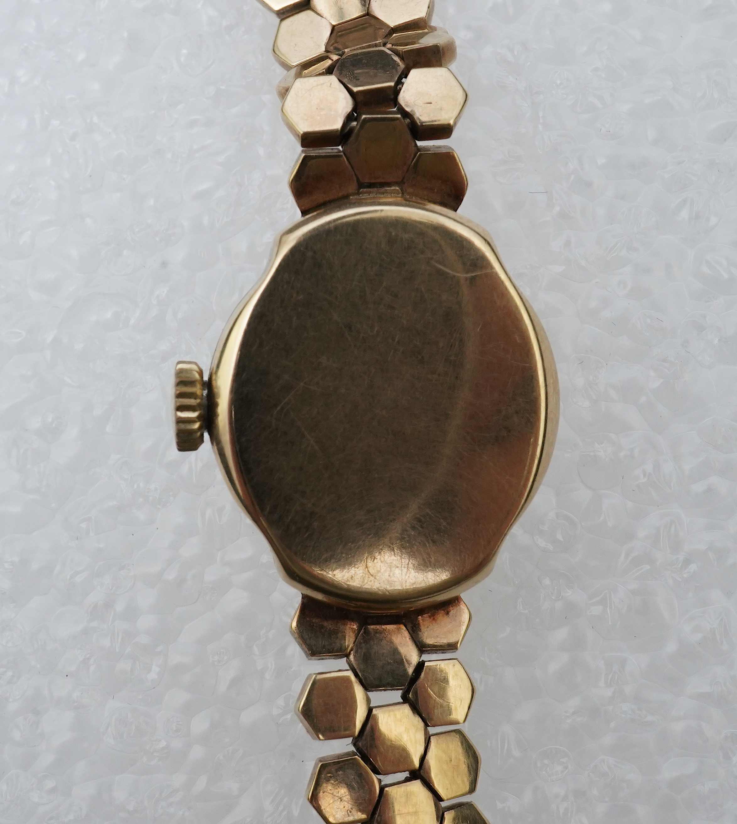Rolex, a lady's gold wristwatch, circa 1957, the circular dial with baton indicators and hands, to a plain gold bezel, and an articulated bracelet composed of hexagonal linking, case width 17mm excluding winder, bracelet length 17cm, manual winding movement, case back interior, dial, movement and bracelet signed Rolex, British hallmarks for 9ct gold, maker's mark B&S, numbered 318273, gross weight 23 grams