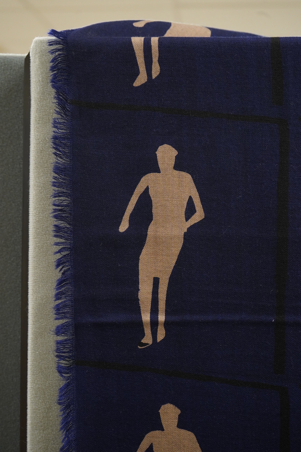 Lot 323 , A 1983 blue wool hand printed beige cut out figures fringed - designed by Fraser Taylor of ‘The Cloth’ (RCA 1983)., 97cm x 294cm long. Condition - good