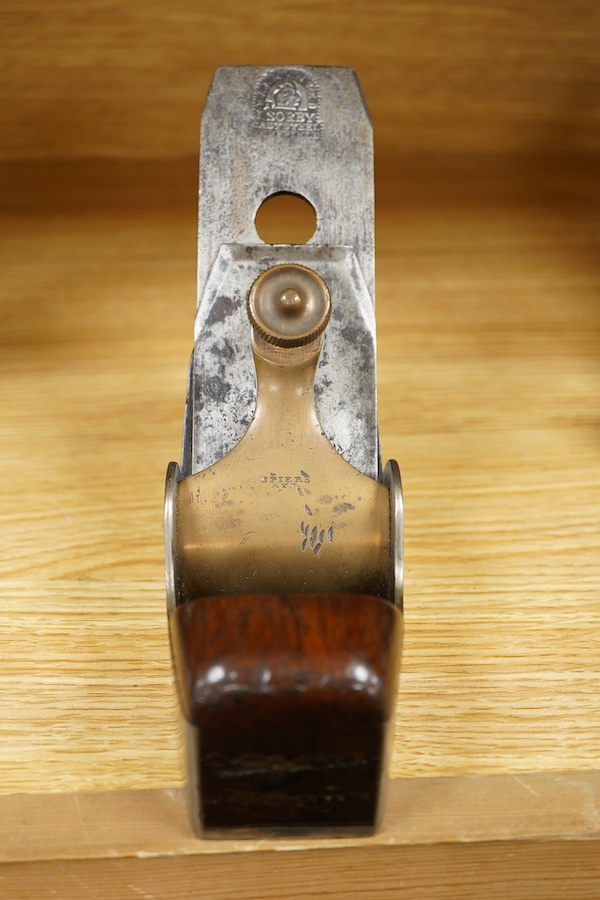 A Spiers dovetailed smoothing plane, stamped with Spiers, Ayr, London to the brass lever cap and fitted with a Sorby iron, with owner’s name stamped to the front infill