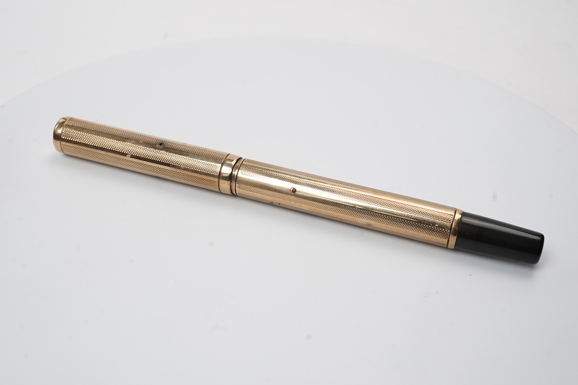 A Waterman FDW 9ct. gold lever fill fountain pen in lined engine turned decoration fitted with Waterman 14ct. gold nib