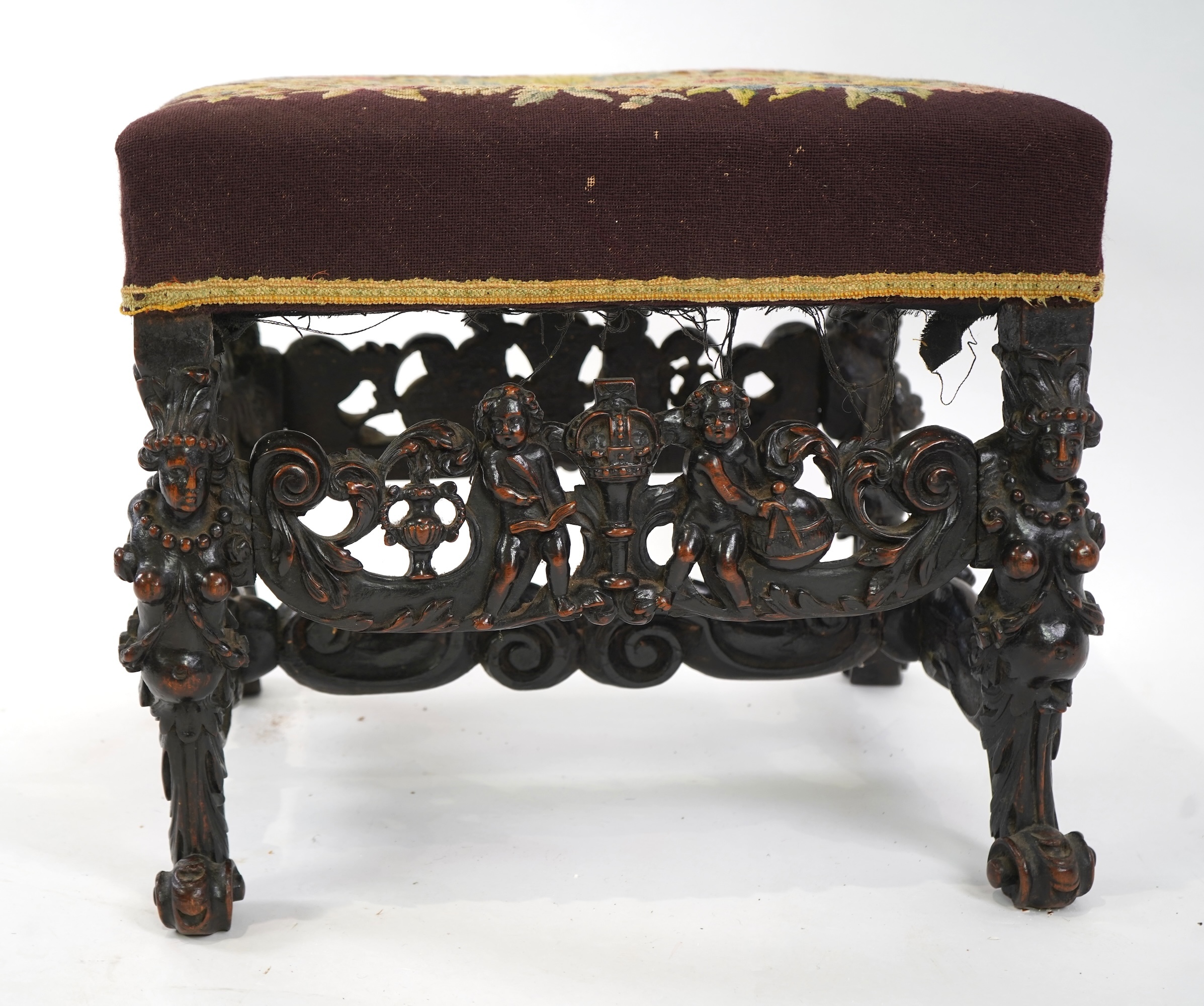 A Charles II walnut dressing stool with later polychrome tapestry seat on heavily carved figural and scroll under frame emblematic of science and literature, 56cm wide, 50cm deep, 45cm high