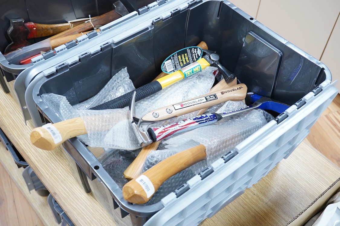 Lot 2254 , A collection of heavy duty hammers, framing hammers, and axes, including; 13 hammers by Vaughan, U.S.A., plus nine others by Stiletto, etc., and 14 carpenters axes and hatchets by James Howarth, Gransfars Bruks, Agdor of