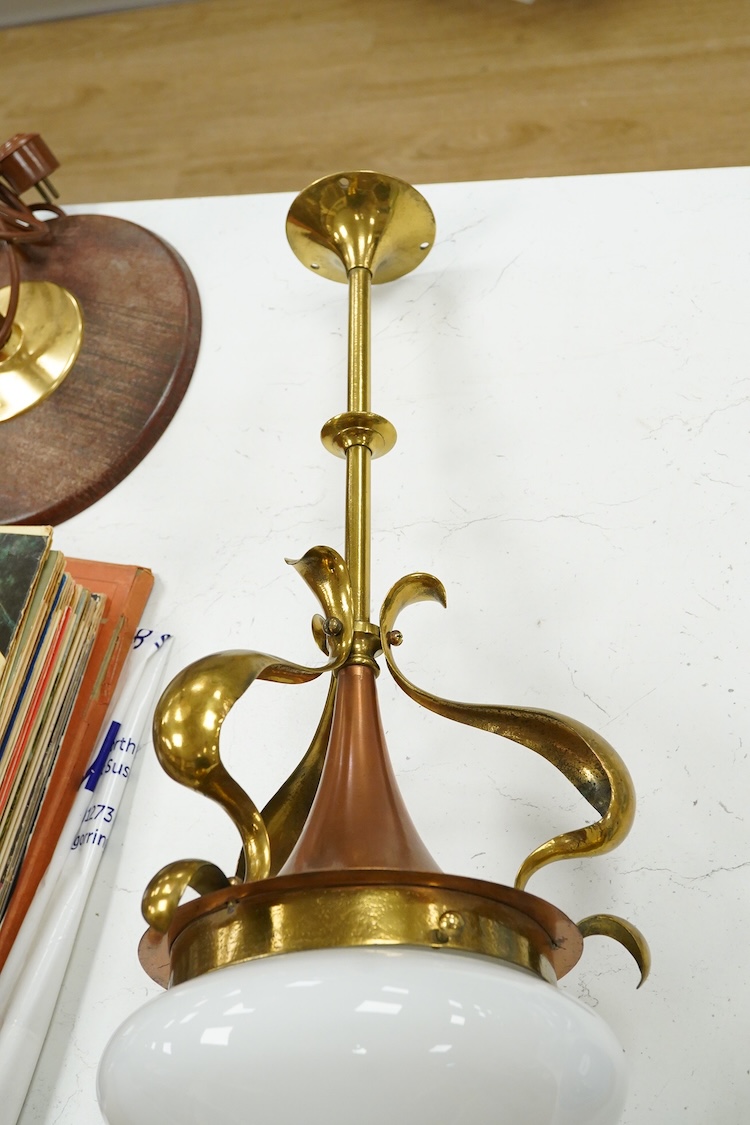 A WAS Benson style Arts & Crafts ceiling light with copper and brass stem and opaque glass shade, 53cm in length
