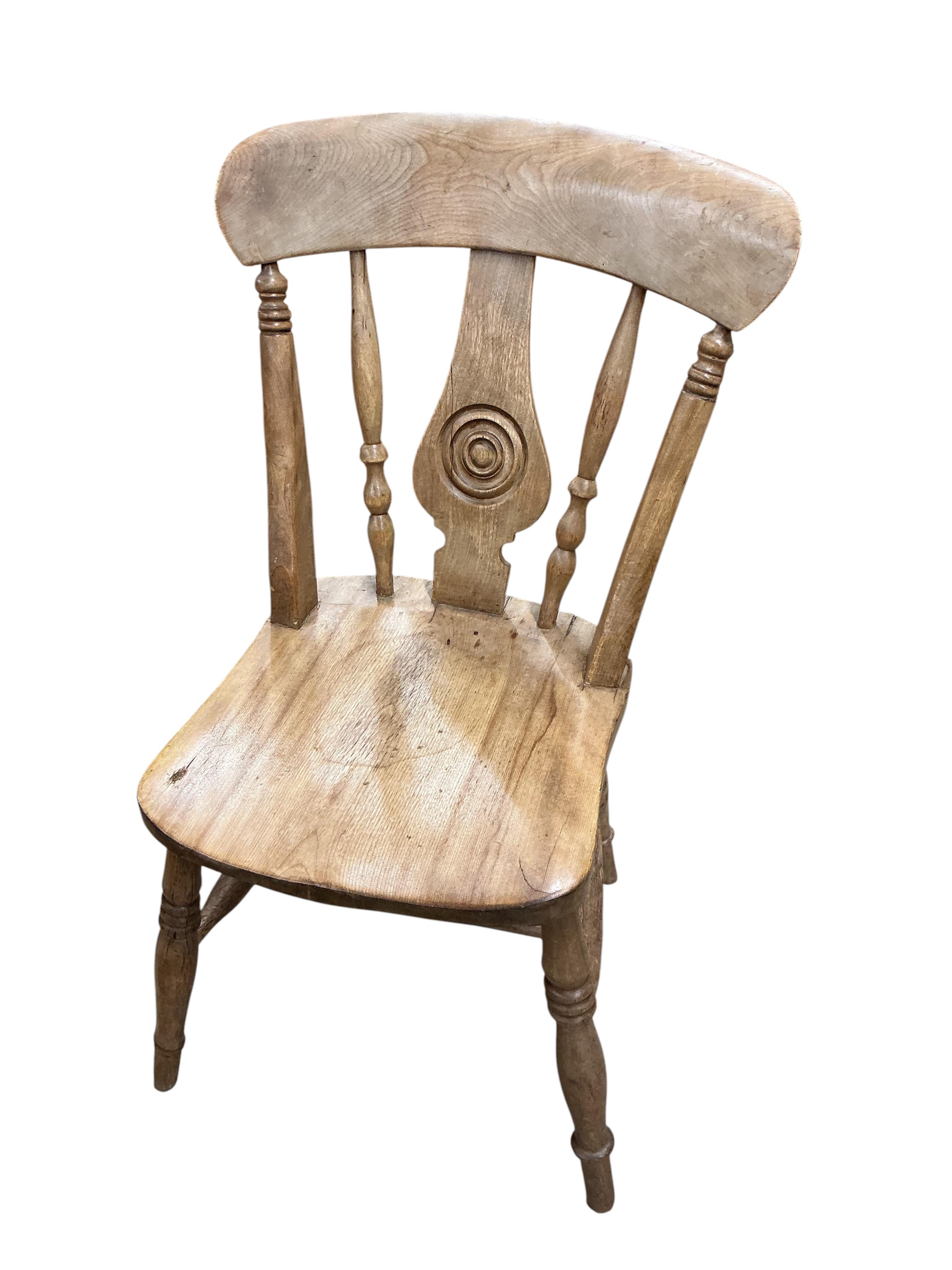 A set of six Victorian elm and beech Windsor kitchen chairs, width 45cm, depth 38cm, height 85cm