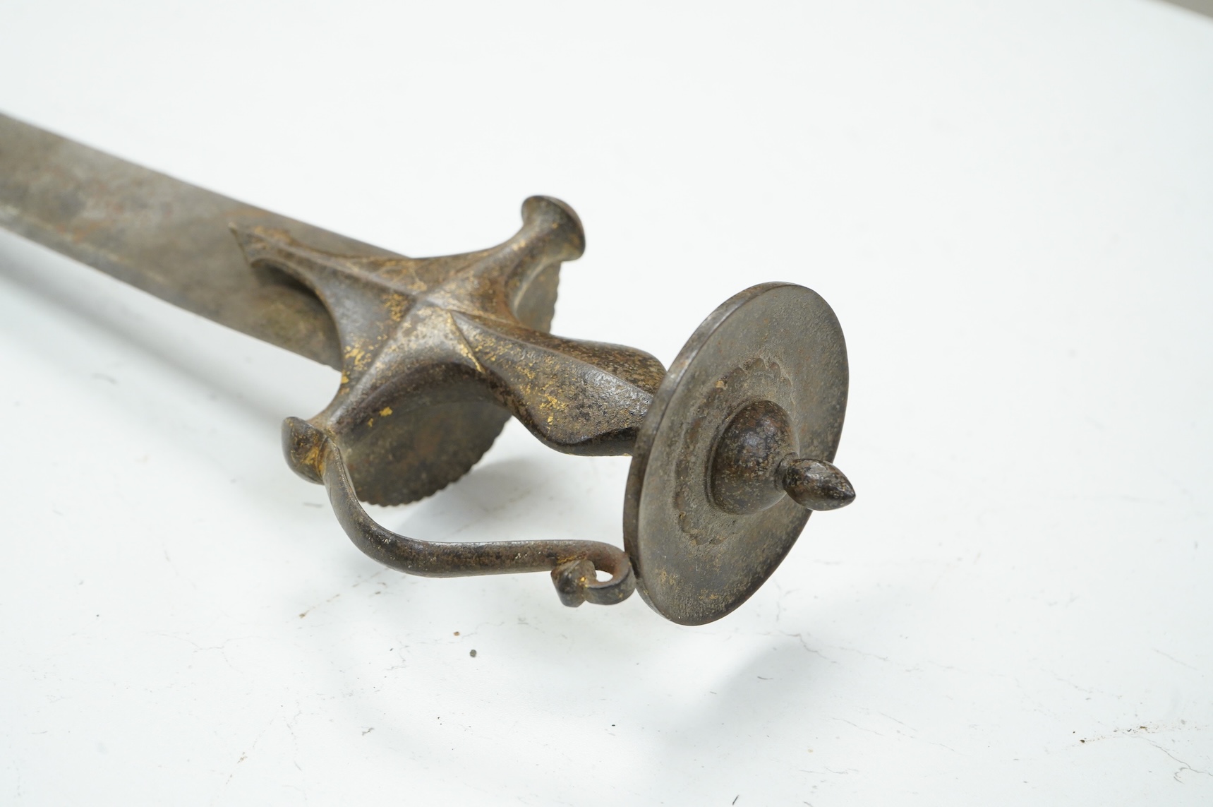 An Indian sword tulwar c.1800 with broad curved single edged blade, iron hilt with traces of gilding and unusual side guard