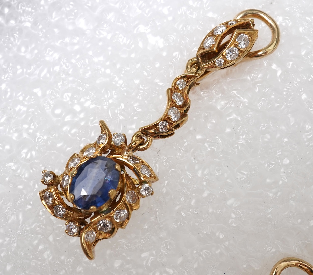 A pair of sapphire and diamond earrings, of pendent design, set with oval sapphires totalling approximately 1.50 carats and brilliant-cut diamonds totalling approximately 1.80 carats, in foliate gold settings, length 4.3cm each, clip and post fittings, stamped 18C, combined gross weight approximately 15.5 grams