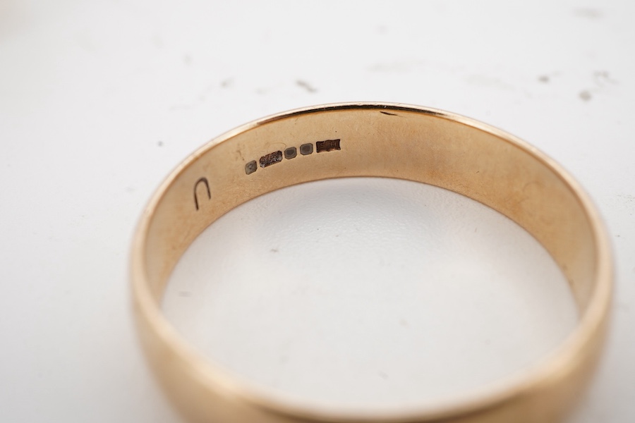 Three gold rings, comprising: a puzzle ring, stamped 14, gross weight approximately 4.5 grams; a signet ring, size Q; and a wedding band, size V, each with British hallmarks for 9ct gold, combined gross weight approximately 7 grams
