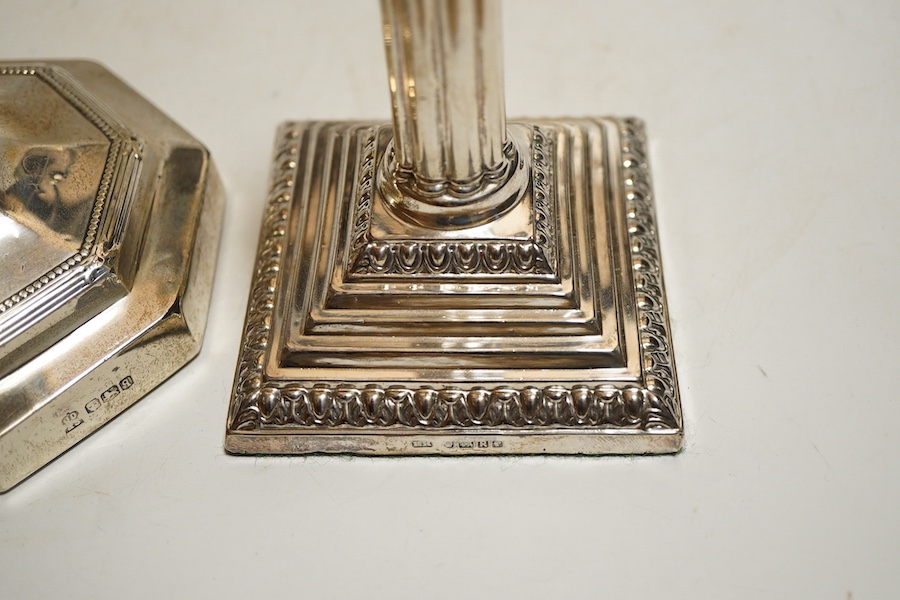 Lot 1839 , A George V silver candlestick, Sheffield, 1933, James Deakin & Sons, weight base together with a Victorian dwarf cluster column candlestick on stepped weighted base, (2)