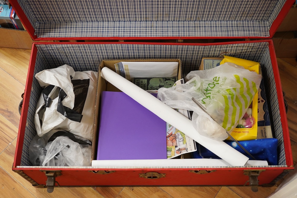 A Pelham Puppet related collection, including four boxed puppets; an Ostrich, a Type SS Clown, a Dutch Girl, a Girl, an oriental lady in a related box, a Junior Pelham Ostrich, together with a number of other marionettes by various other makes, books relating to puppets and marionettes, scenery for a puppet theatre and a back cloth, etc. all contained within an early 20th century red fabric covered travelling trunk