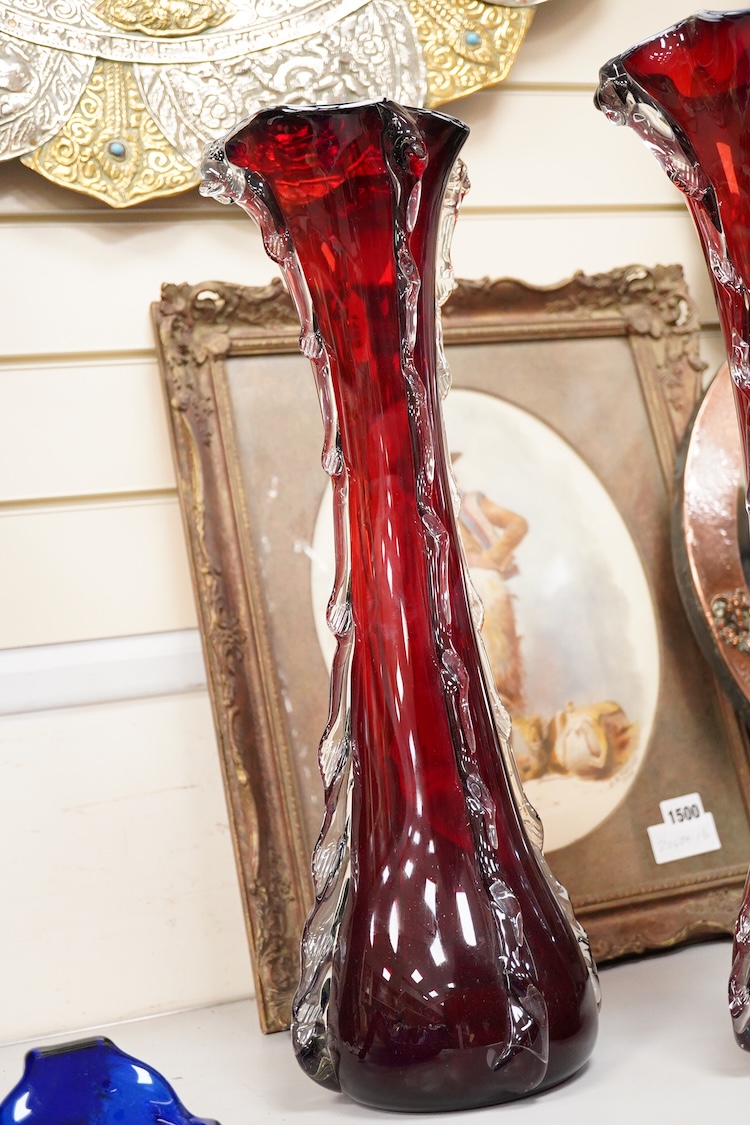 Lot 1493 , A pair of tall ruby and clear glass vases, 51cm high