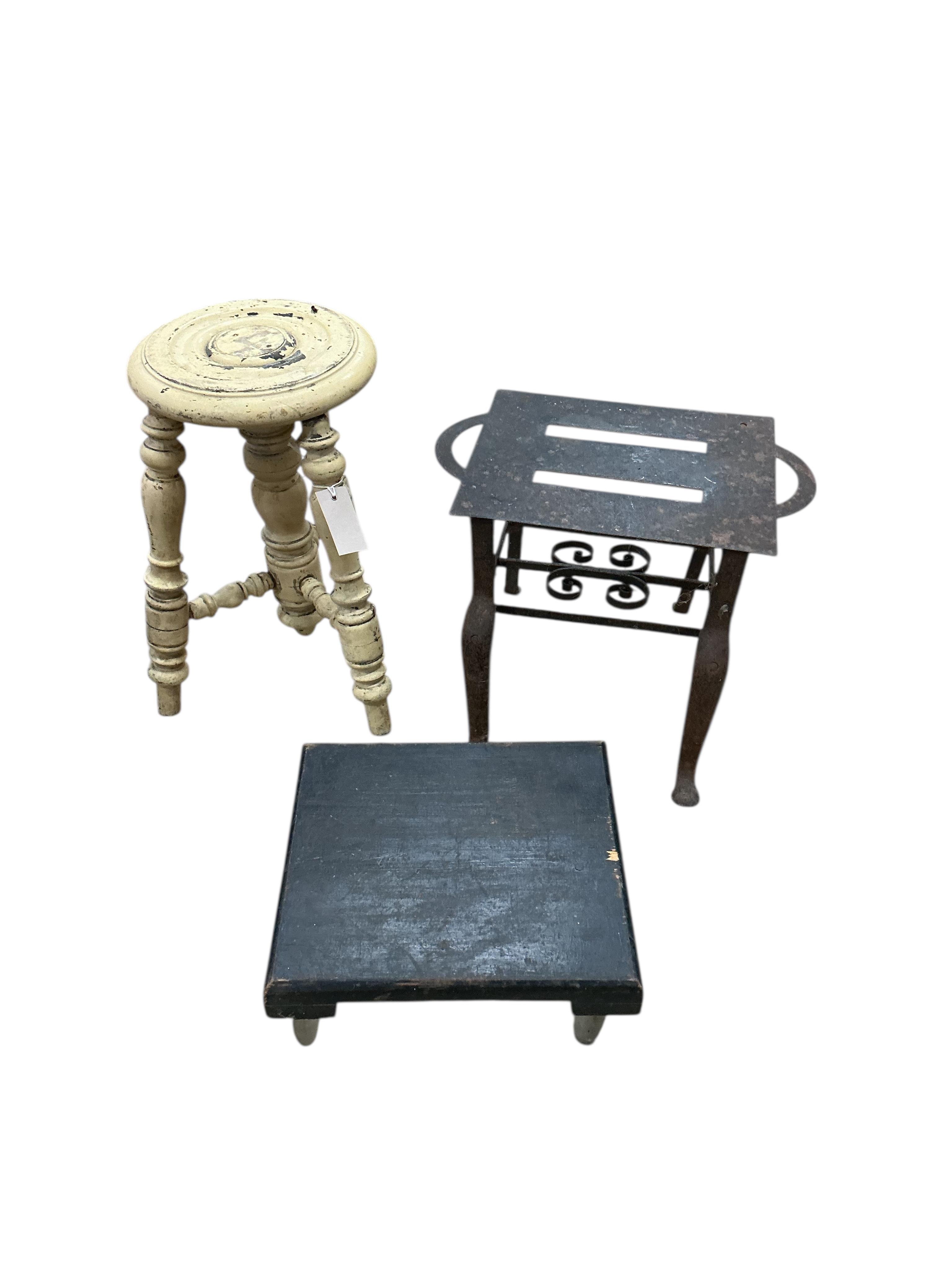 Lot 2050 , Four 19th century Provincial stools, together with two glass legged stands and an iron trivet