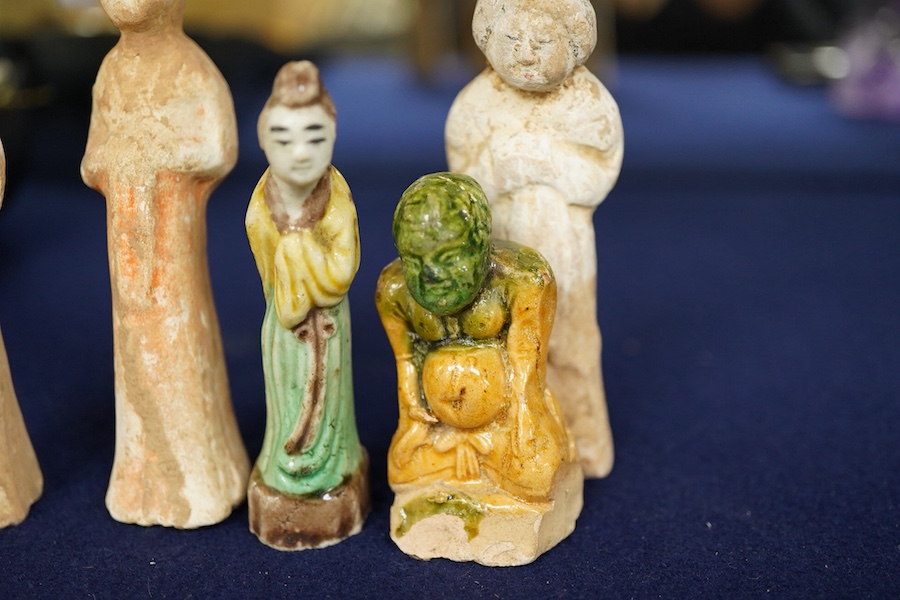 Lot 2481 , A Chinese Ming sancai small figure, three miniature pottery figures of ladies, Tang dynasty or later, and a sancai glazed figure (5)