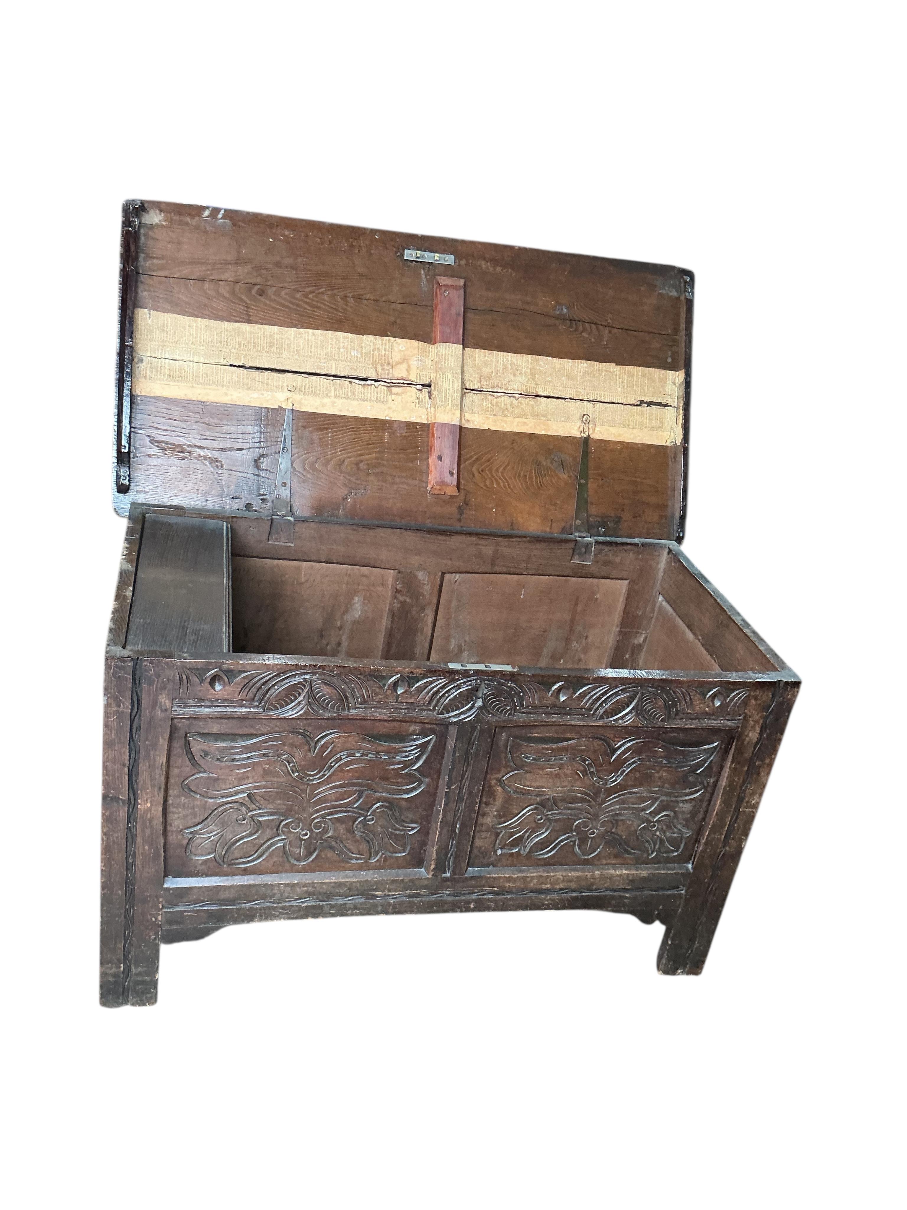An early 18th century carved oak coffer, width 118cm, depth 60cm, height 69cm