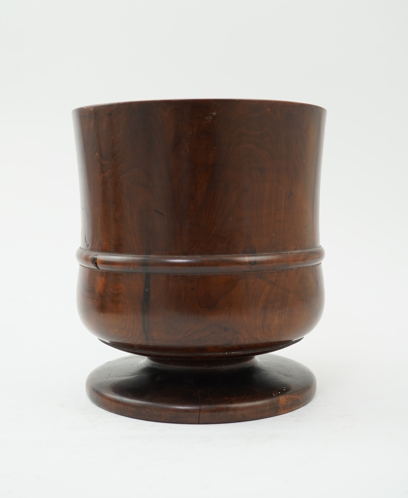 A lignum vitae wassail bowl, late 18th/early 19th century, with raised band to the girdle, on a spreading pedestal shaped foot, 21cm high, 19.5cm diameter