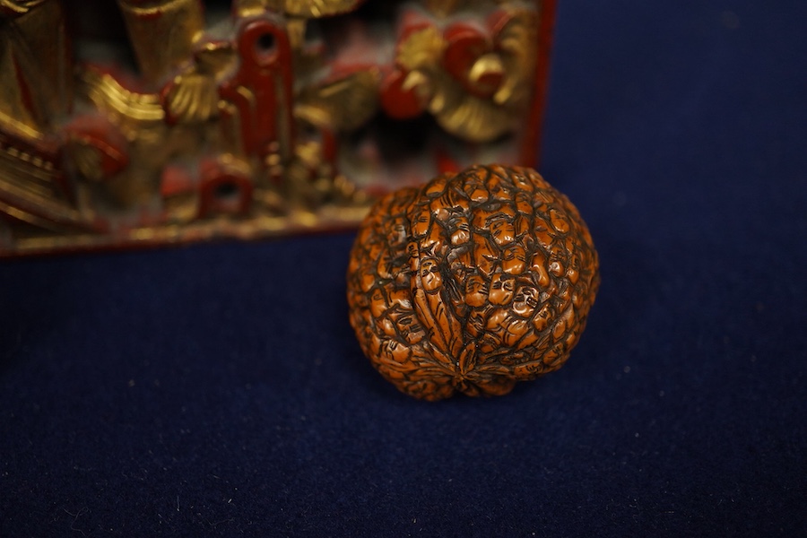 A Chinese carved and giltwood panel, sancai figure and carved coquilla nut, largest 21 x 14.5cm