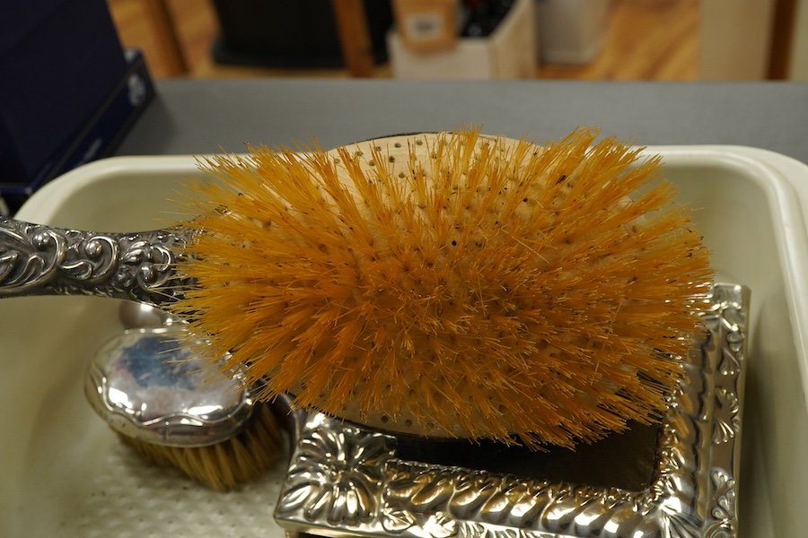 A small group of silver and white metal items, including an Edwardian silver and tortoiseshell mounted hand mirror by Samuel Jacob, 26.1cm, a silver mounted hair brush, a small silver mounted brush, a repousse silver pin dish, a silver spectacles case, a pair of 800 standard white metal small dishes, a sterling mounted posy vase and a white metal mounted rectangular photograph frame.