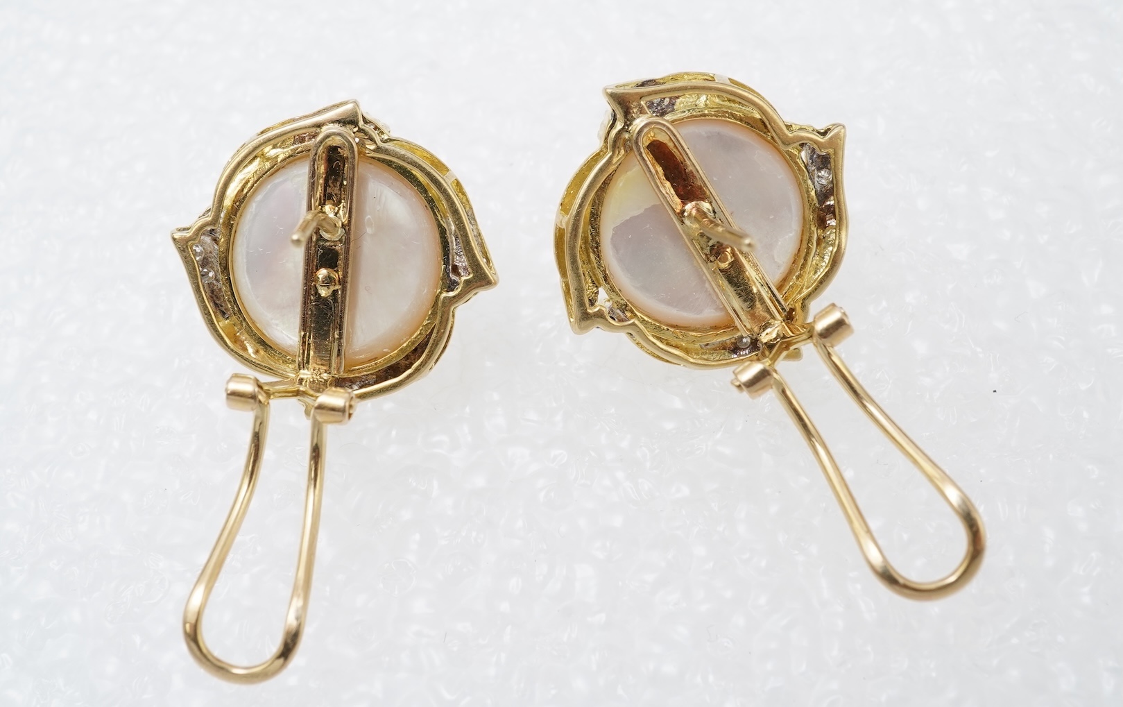 A pair of mabé cultured pearl and diamond earrings, each set with a mabé cultured pearl within a foliate border of polished gold set with brilliant-cut diamonds totalling approximately 0.30 carats, mounted in 18ct gold, length 2cm each, clip and post fittings, British hallmarks, combined gross weight approximately 9.5 grams, one diamond deficient