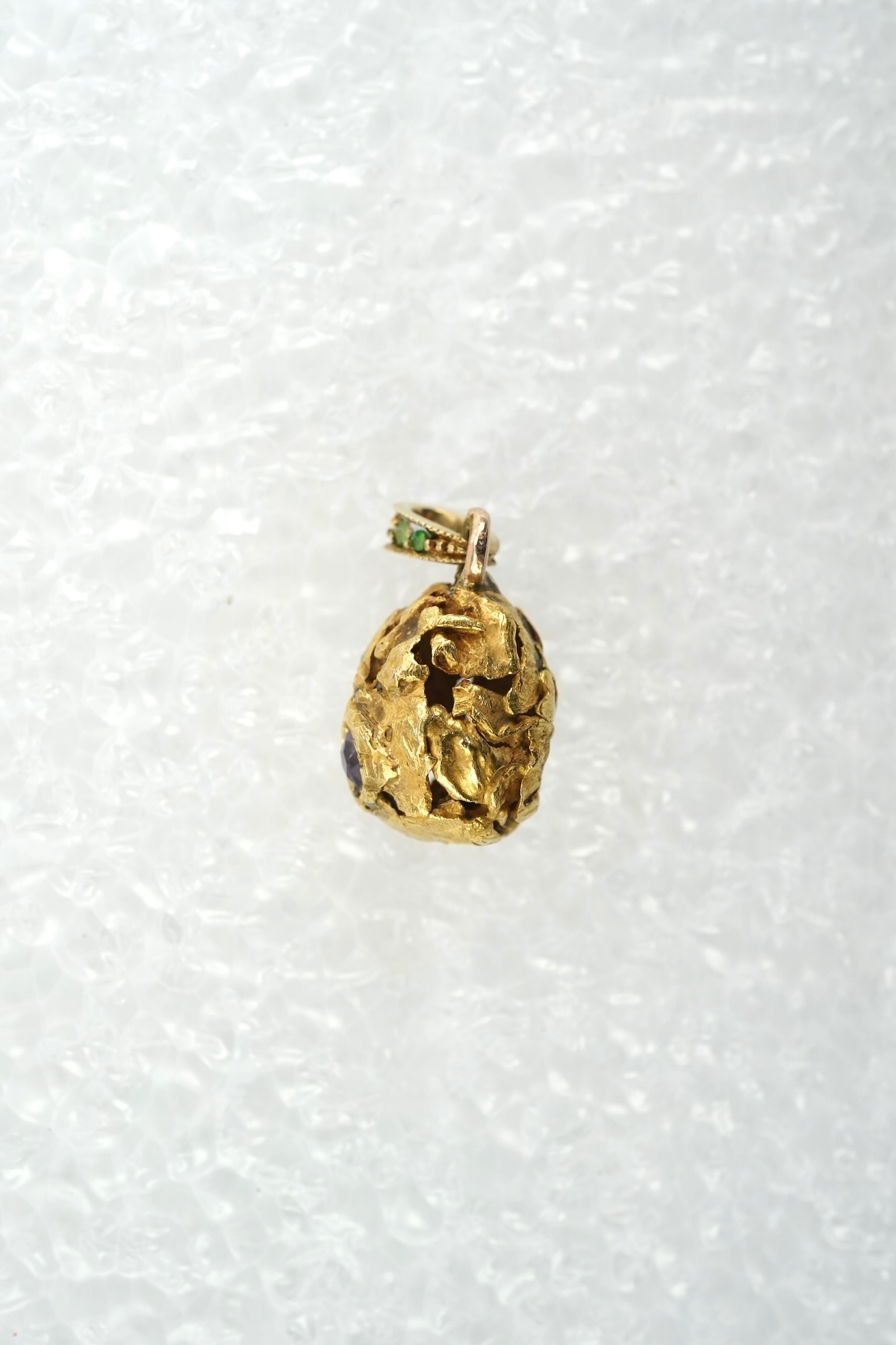 A gem-set egg pendant, Russia, early 20th century, the hollow egg pendant of textured gold in the samorodok style, set with a circular-cut aquamarine and amethyst, suspended from a bail set with demantoid garnets, length 1.9cm including bail, Russian 56 zolotnik assay mark, indistinct workmaster's stamp, gross weight approximately 1.8 grams, one demantoid garnet deficient