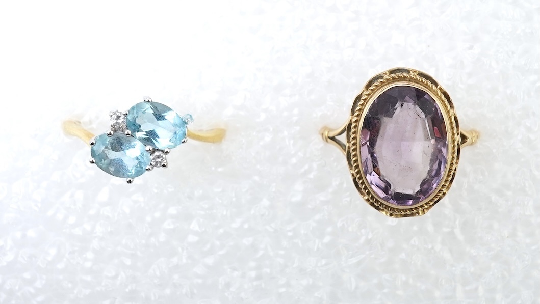 A collection of amethyst and aquamarine jewels, comprising: a bar brooch and ring, each set with an oval amethyst, brooch 5.4cm, ring size M, ring with British hallmarks for 9ct gold, combined gross weight approximately 9.5 grams; together with a bar brooch set with an oval aquamarine and a cultured pearl in 9ct gold, length 5.1cm, British hallmarks, gross weight 3.5 grams; and a ring, set with two oval aquamarines and two brilliant-cut diamonds, mounted in 18ct gold, size N, British hallmarks, gross weight approximately 3.5 grams