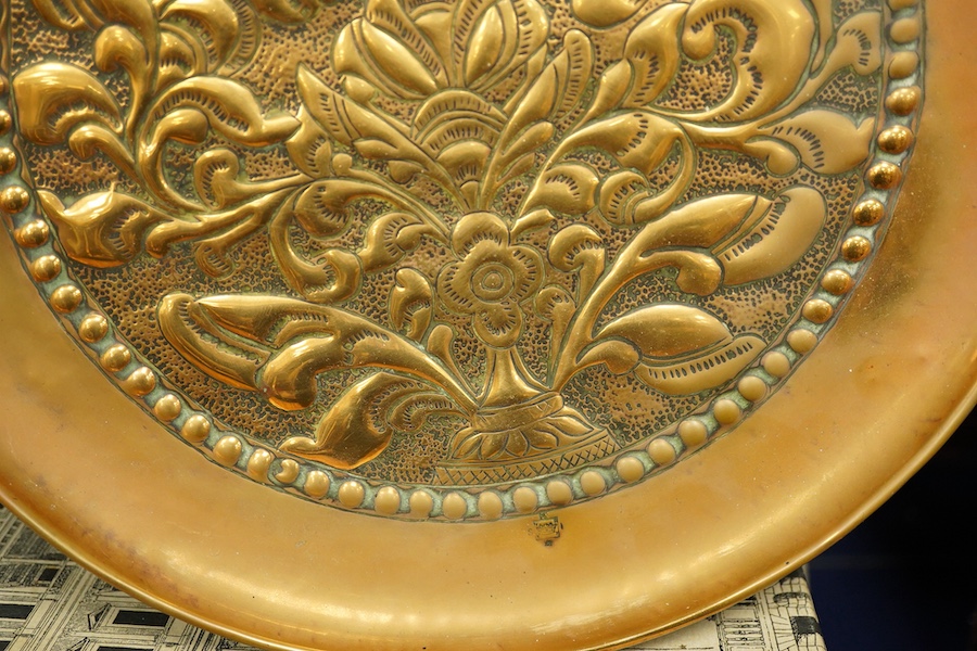 Keswick school of Industrial Art - an embossed brass dish, 29cm