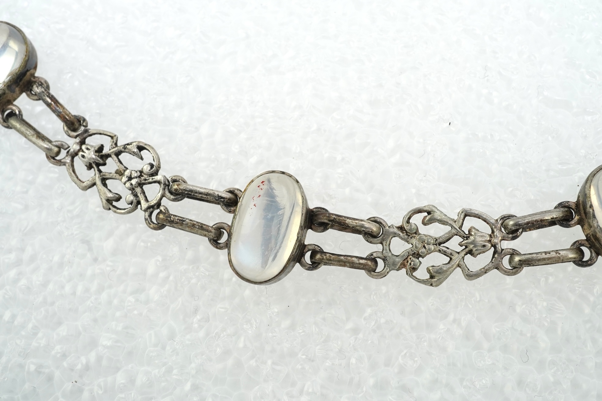 A moonstone necklace and an amber necklace, early 20th century, the amber necklace composed of graduated beads measuring approximately 0.8 - 2.2cm, length 55cm; together with a necklace composed of foliate silver links collet-set with moonstone cabochons, length approximately 39cm