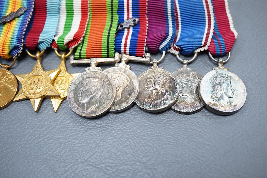 A cased miniature medal group comprising; a CBE, a First World War medal pair with oak leaf on the Victory Medal, the 1939-1945 star, the Italy star, the Defence Medal, the 1939-1945 Medal, and three Coronation medals for George V, George VI, and Elizabeth II