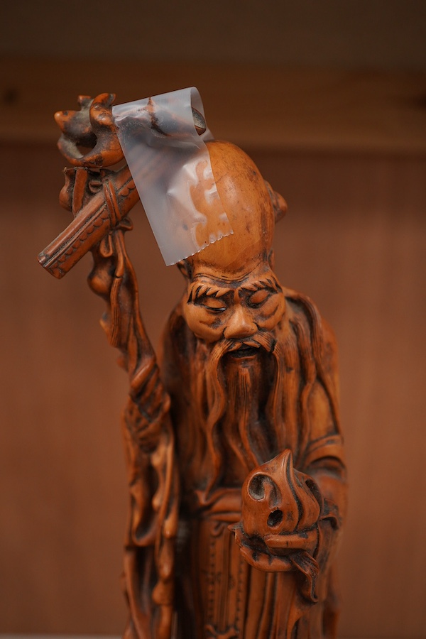 Two Chinese carved boxwood figures, one of Shao Lao, the other of Guan Yin, both on stands, on stands. tallest 26cm