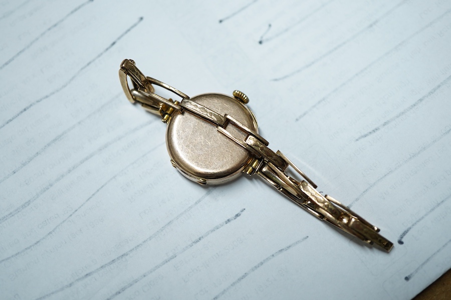 A lady's George V 9ct gold manual wind wrist watch with 'telephone' dial, case import marked for Glasgow, 1922, on a 9ct expanding bracelet.
