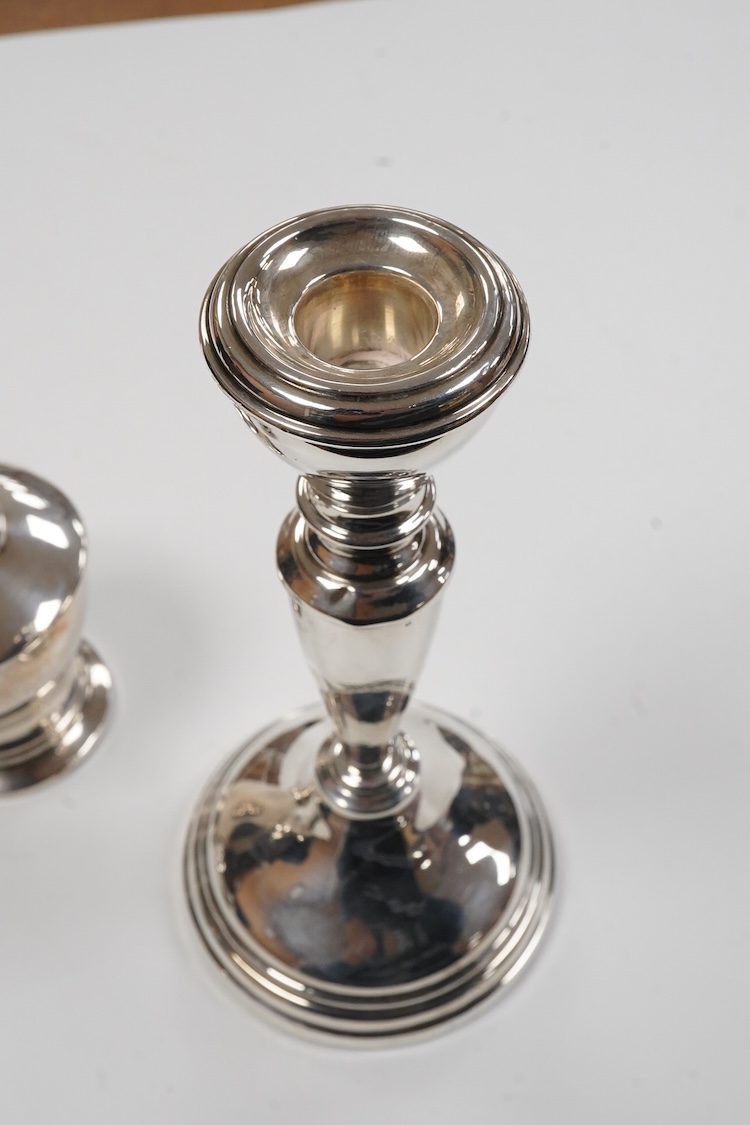 A pair of Elizabeth II silver candlesticks, Elkington & Co, Birmingham, 1965, height 19cm, weighted and a George V small silver tea caddy.