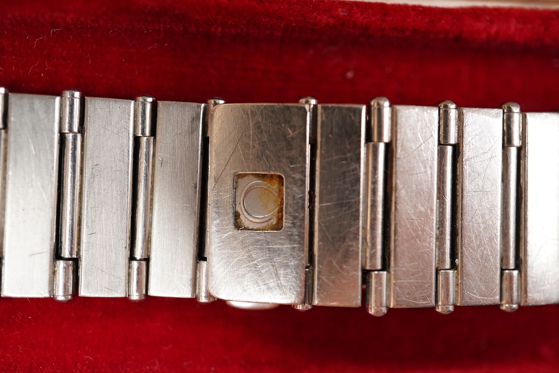 Lot 1904 , A gentleman's recent stainless steel Omega Constellation Chronometer quartz wrist watch, with Roman dial and date aperture, case diameter 34mm, on a stainless steel Omega bracelet, with Omega box, no papers, (a.f.).