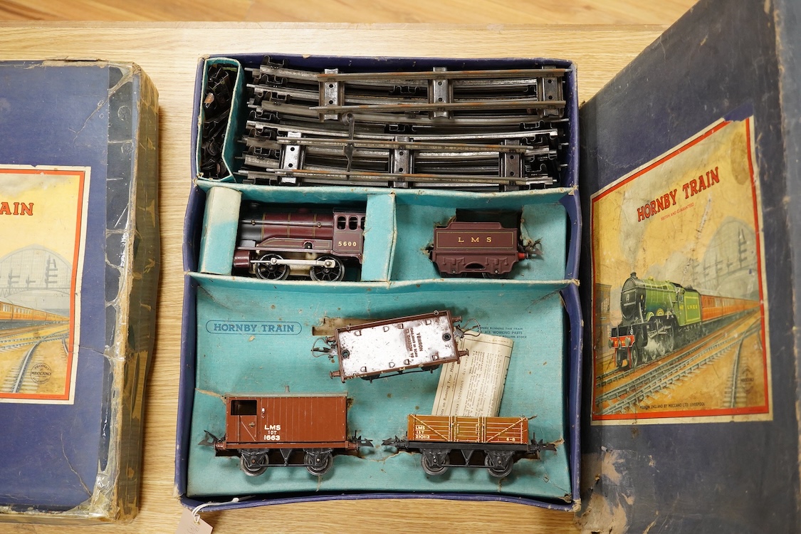 Two Hornby 0 gauge tinplate clockwork train sets; a No.601 LMS Goods Set with 0-4-0 tender locomotive, 5600, in maroon livery, etc., together with a No.501 LNER passenger set with 0-4-0 tender locomotive, 1842, in green livery, three 4-wheel teak coaches, etc., boxes af