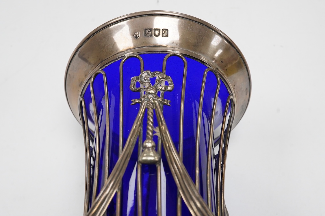 A George V pierced silver trumpet shaped flower vase, with blue glass liner, indistinct maker's mark, London, 1911, 19.7cm.