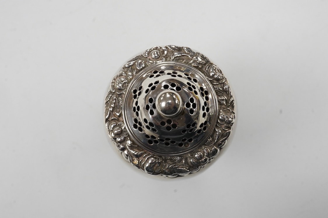 A George IV silver pounce pot, by Joseph Angell I, with foliate decoration, London, 1823, height 12.7cm, 4.2oz.