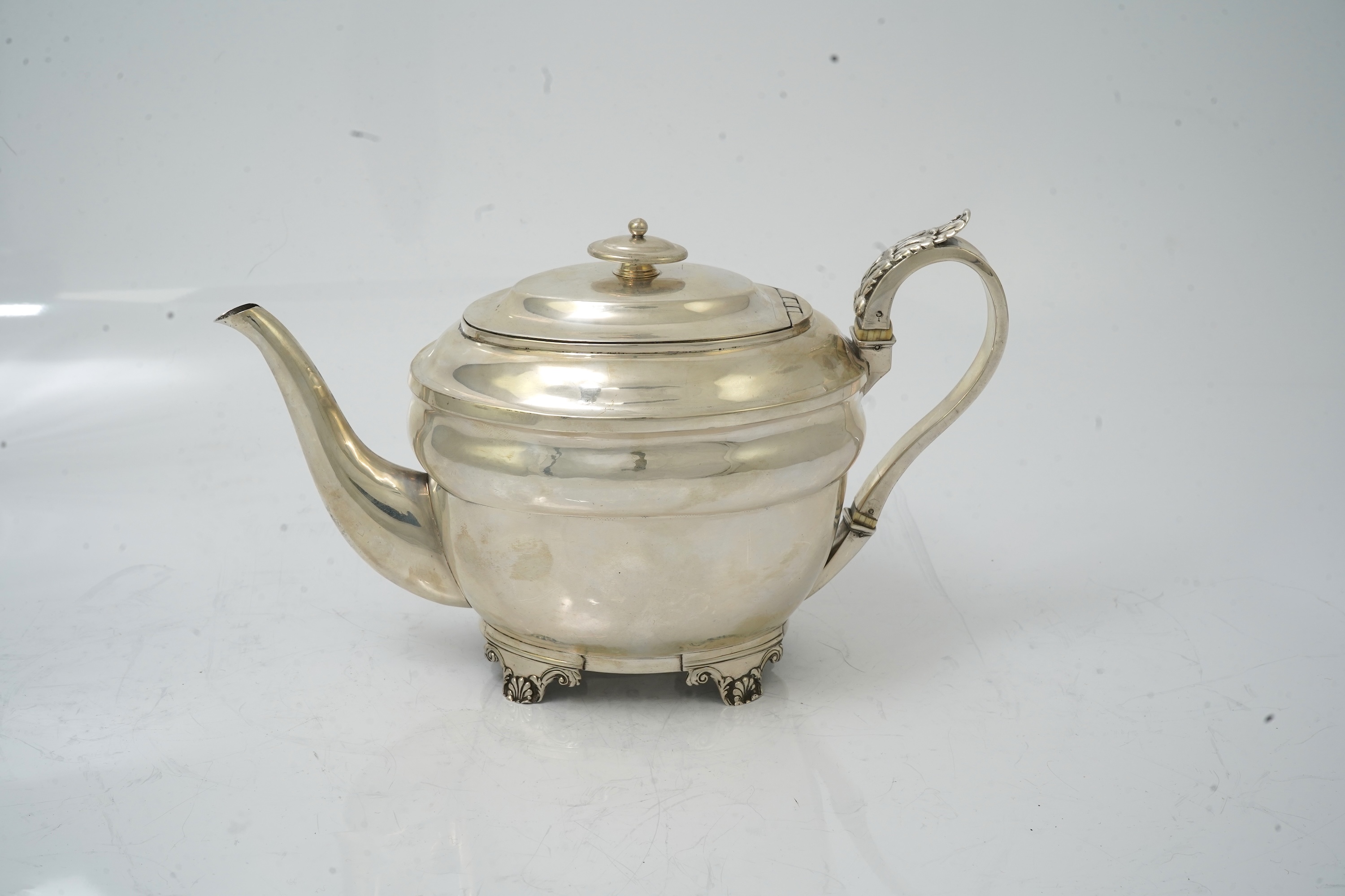 A George III provincial silver teapot, by Dorothy Langlands, of oval form, Newcastle, 1804, with acanthus leaf capped handle, on four shell and scroll feet, (patched and repaired), gross weight 18oz.