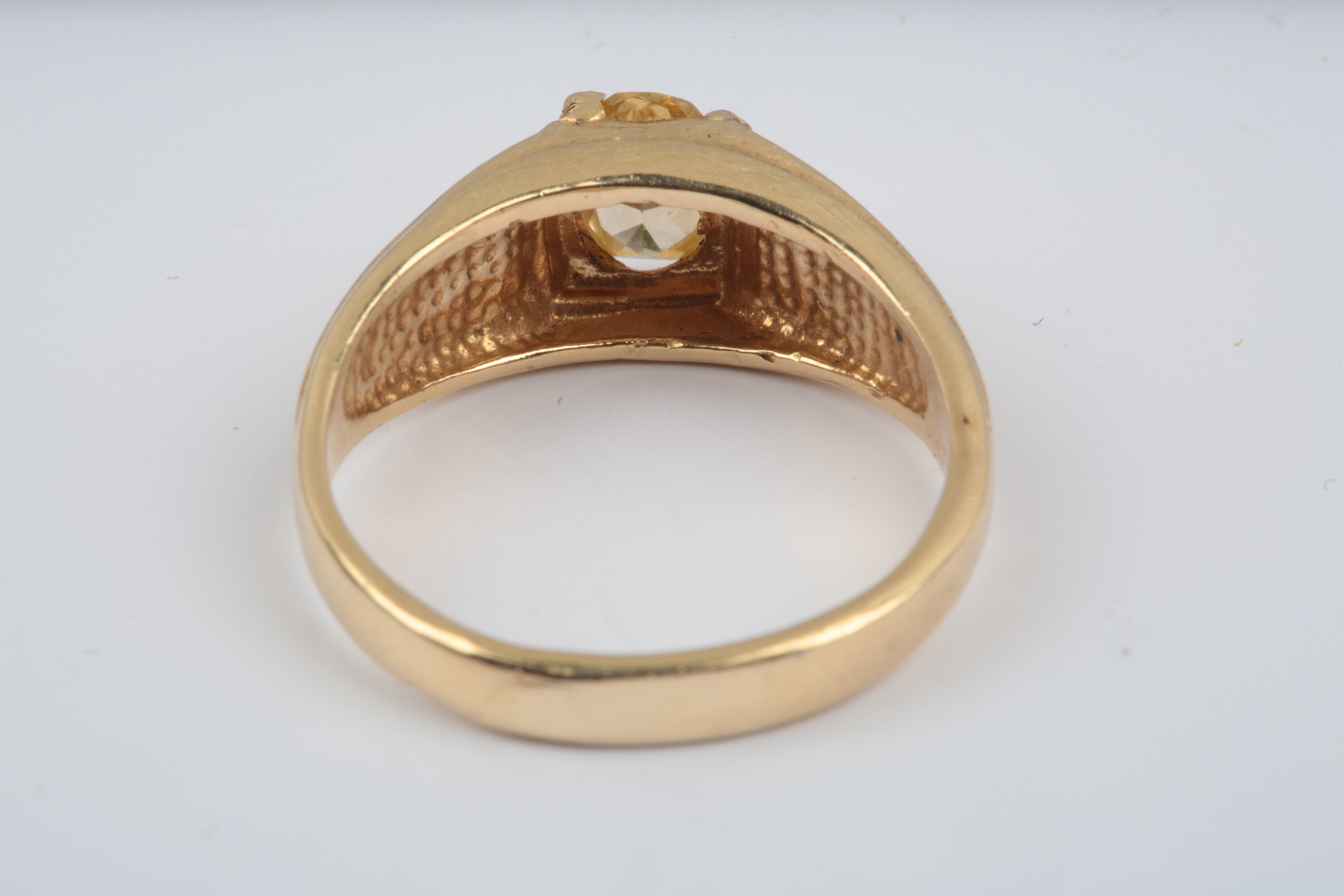 A yellow diamond ring, claw-set with an oval yellow diamond weighing approximately 0.50 carats, to a tapering gold band, size R, stamped 14K, gross weight approximately 4.5 grams
