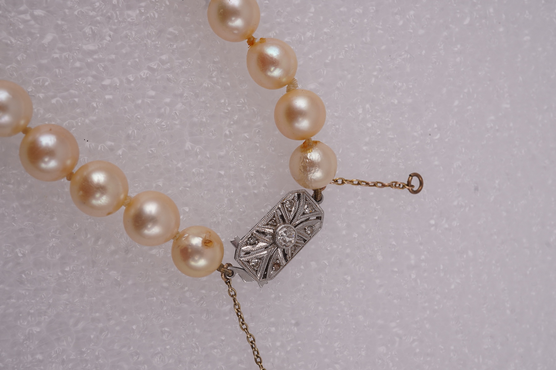 A cultured pearl necklace and pair of earrings, comprising: a necklace composed of cultured pearls measuring approximately 8.5mm, to a plaque clasp set with brilliant-cut diamonds totalling approximately 0.30 carats, length 39.5cm; and a pair of pendant earrings suspending drop-shaped cultured pearls from links set with single-cut diamonds, mounted in silver and gold, length 3.7cm each, hook fittings