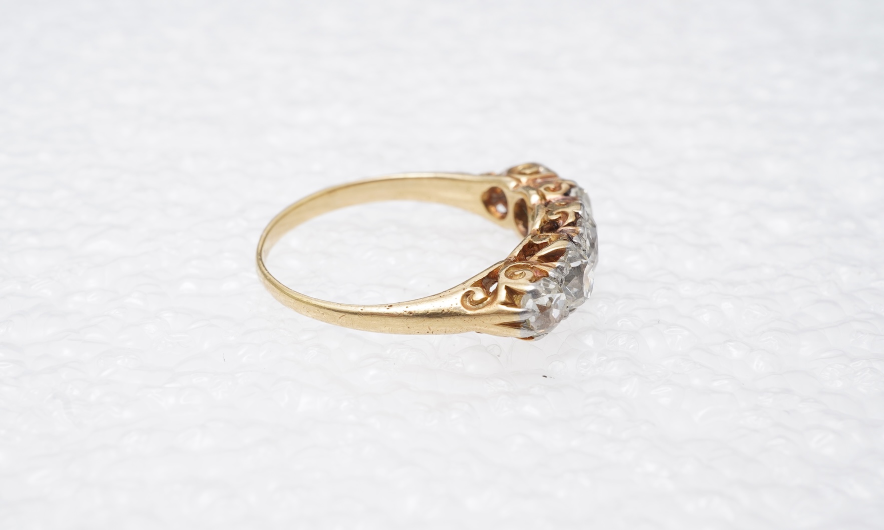 A late Victorian five-stone diamond ring, circa 1900, claw-set with a graduated sequence of five cushion-shaped diamonds totalling approximately 1.10 carats, in a gold setting with scrolled galleries, size N1/2, gross weight approximately 3.5 grams