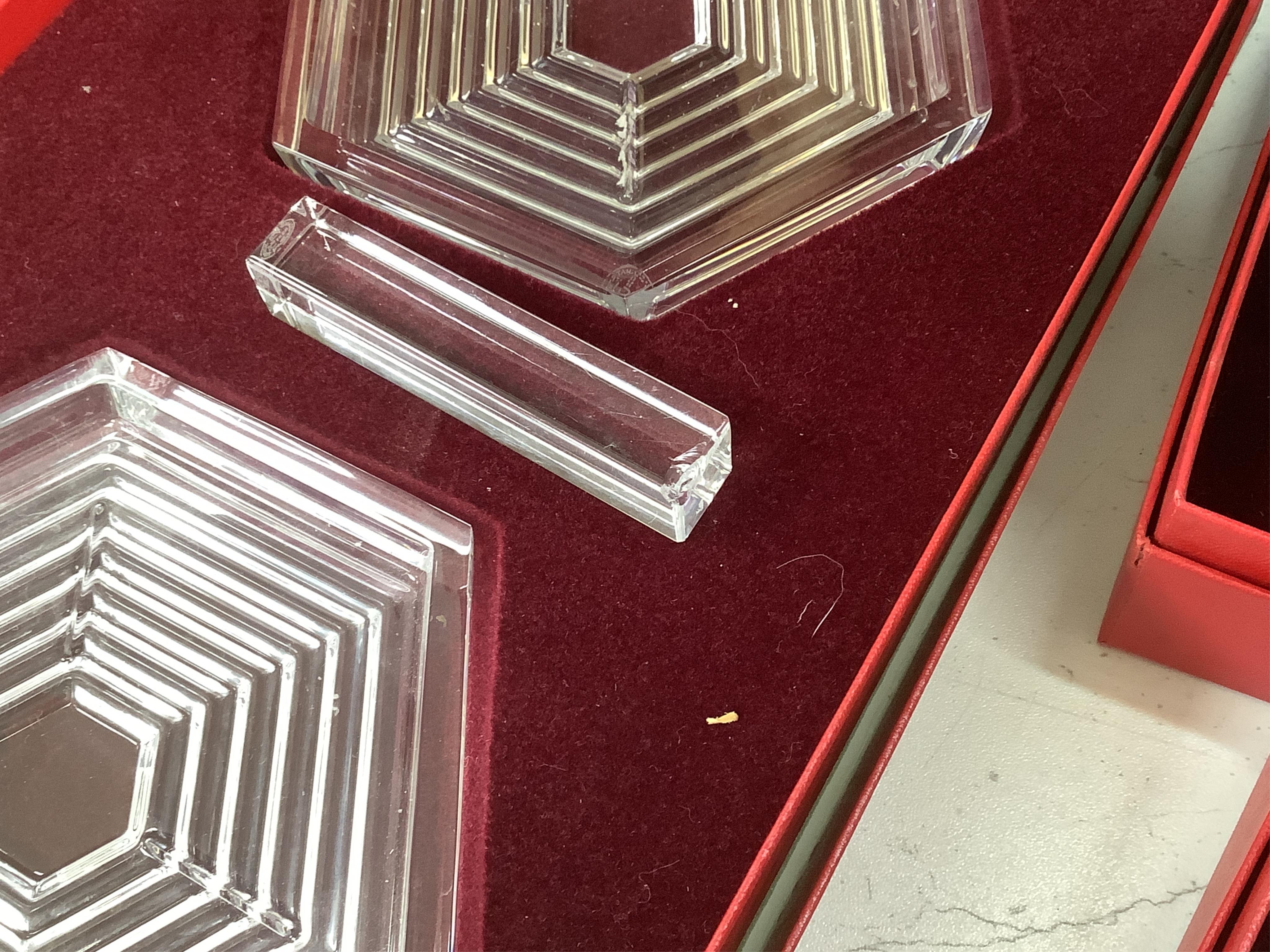 One of the twelve knife rests chipped, image 3. All others inspected and found to be undamaged and near-excellent apparent cloudiness is dust which wipes away. Boxes good.